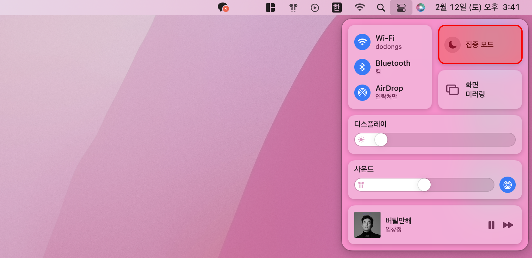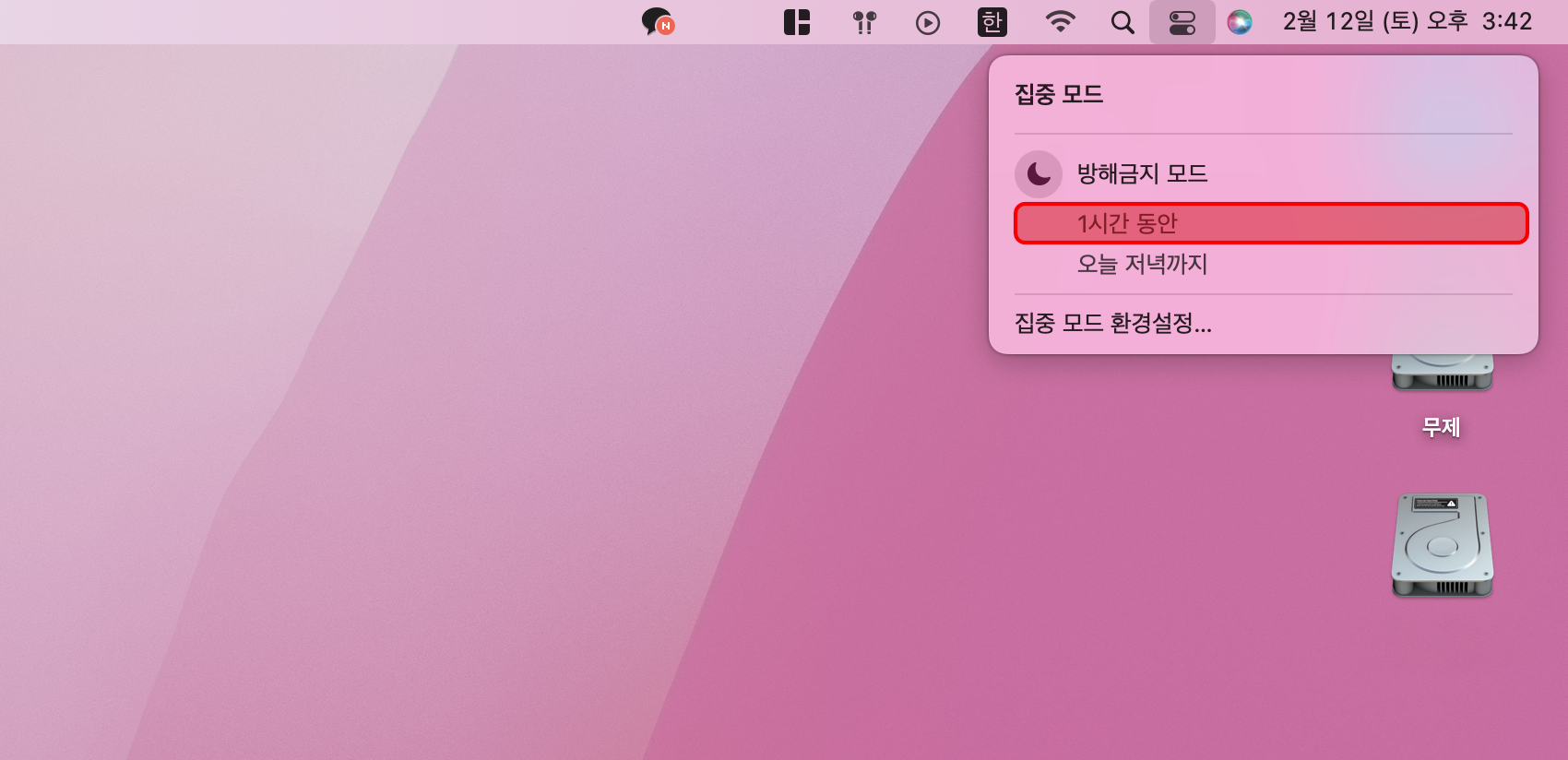 우측 상단의 메뉴의 제어 센터에서 집중 모드를 손쉽게 실행할 수 있습니다.