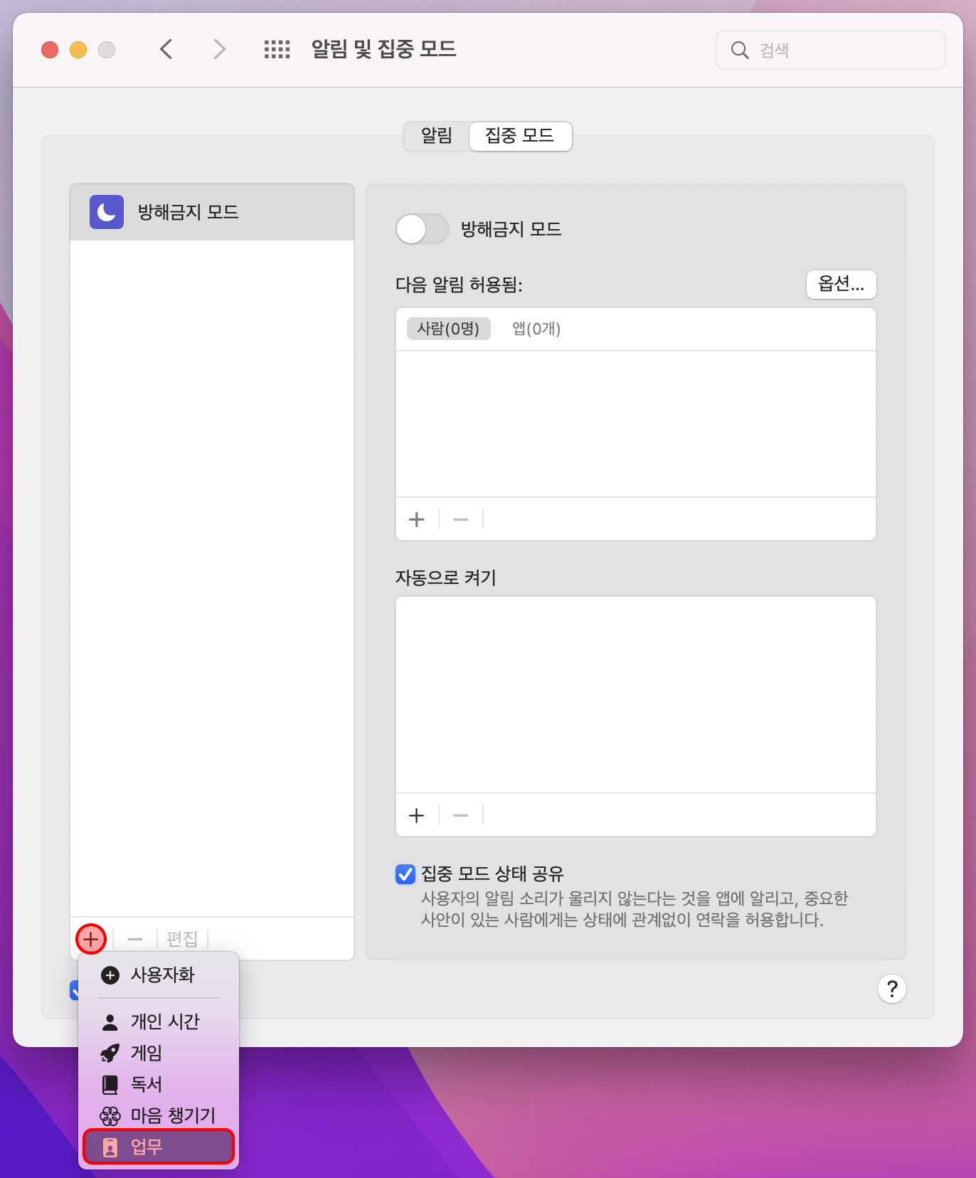 기본적으로 설정되어 있는 방해금지 모드 외에 여러분이 별도의 모드를 구분하여 사용하고 싶다면, 집중 모드 설정에서 별도로 추가하여 사용할 수 있습니다. 좌측 하단의 + 버튼을 누르고, 원하는 모드를 선택하거나 사용자화를 눌러서 추가할 수 있습니다.