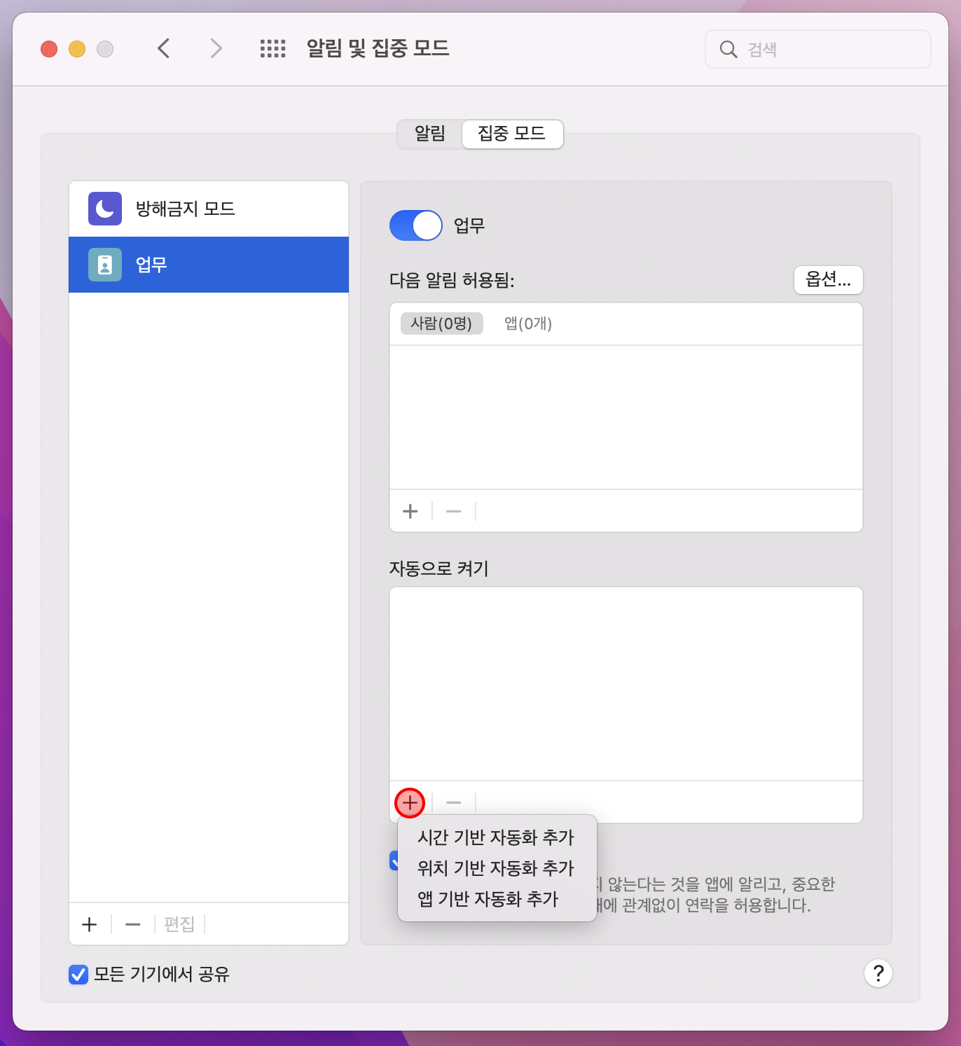 선택한 모드를 일정 시간 또는 장소, 앱에 따라 자동으로 실행될 수 있도록 설정할 수 있습니다. 하단의 자동으로 켜기 옵션에서 + 버튼을 누르고, 원하는 기반의 자동화 추가를 선택하여 진행하시면 됩니다.