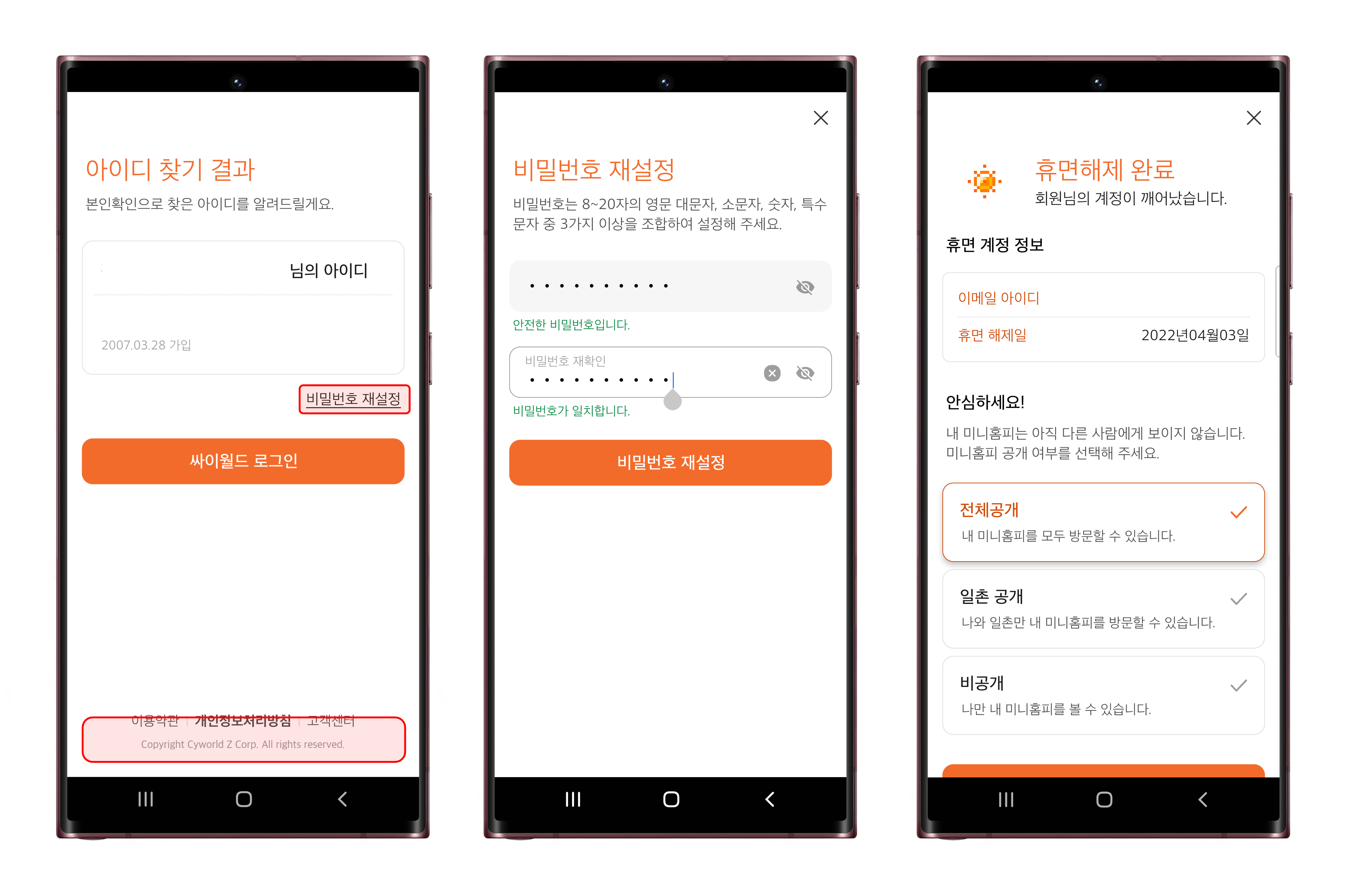정상적으로 로그인을 진행한 후에는 휴면 해제가 필요합니다. 휴면 해제를 끝낸 후에는 미니홈피 공개 여부를 선택할 수 있습니다.