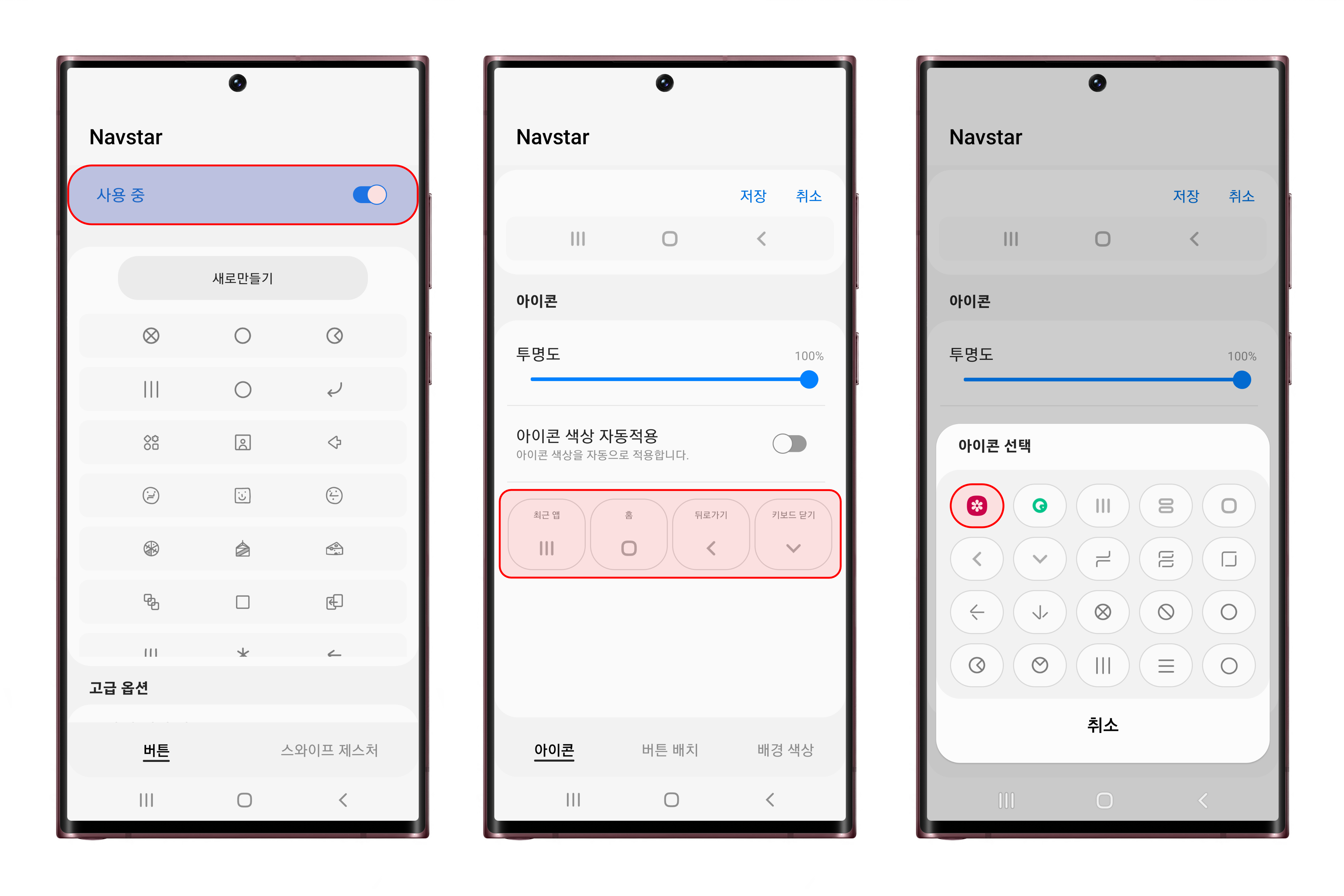 NavStar를 다운로드 및 설치한 후에는 Unit 탭에 설치되어 있는 NavStar를 실행하여 해당 기능을 사용 중으로 변경해 주세요. 해당 기능을 활성화한 후에는 미리 만들어져있는 프리셋을 사용하거나 새로만들기 버튼을 눌러서 원하는 아이콘으로 변경이 가능한데요. 아이콘 탭에서는 최근 앱, 홈 뒤로가기, 키보드 닫기 아이콘을 변경할 수 있습니다. 변경하고 싶은 아이콘을 누르고, 기존에 제공하는 이미지를 사용하거나 갤러리에 있는 이미지를 선택해서 사용할 수도 있습니다.