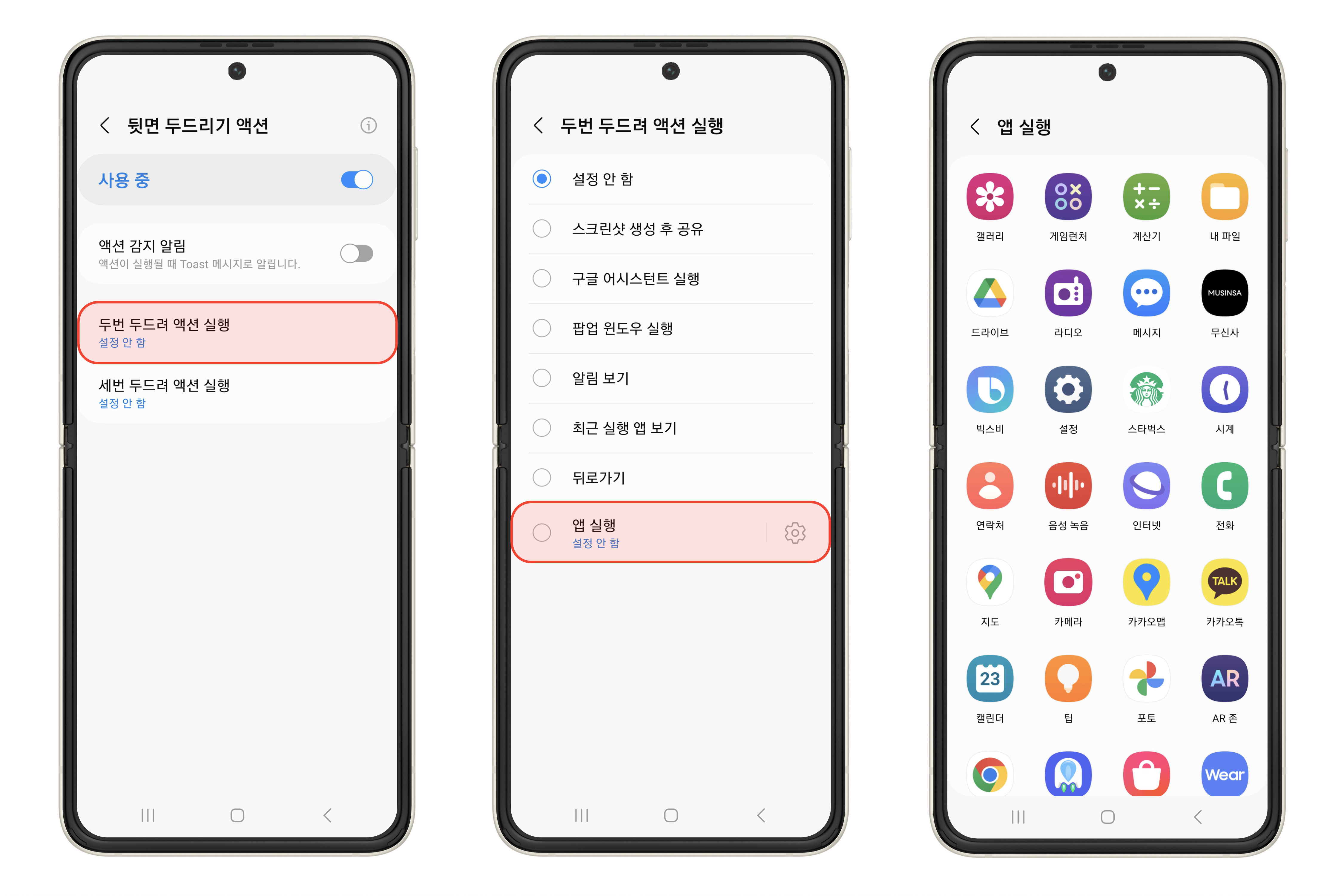 뒷면 두드리기 액션 설정 페이지에서는 두 번 두드려 액션 실행 및 세 번 두드려 액션 실행의 두 가지 방법에 각각 원하는 기능을 할당할 수 있는데요. 보고 있는 화면을 캡처하여 공유하거나, 원하는 앱을 실행하는 등의 다양한 기능을 할당할 수 있으니, 여러분의 사용 패턴에 맞게 선택하여 사용해 보세요.