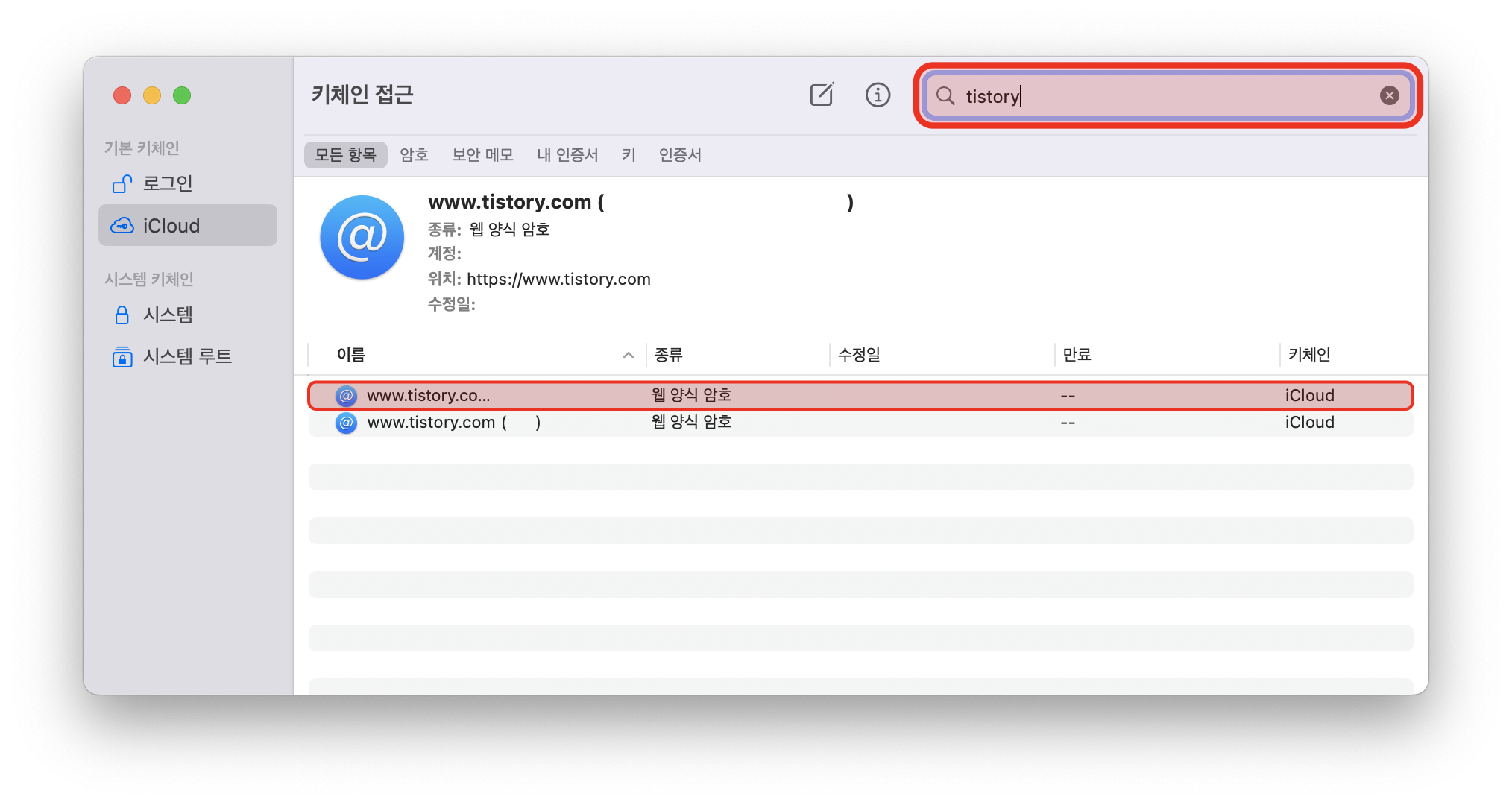 키체인 접근 페이지에서 원하는 페이지를 검색한 후, 원하는 계정을 선택합니다.