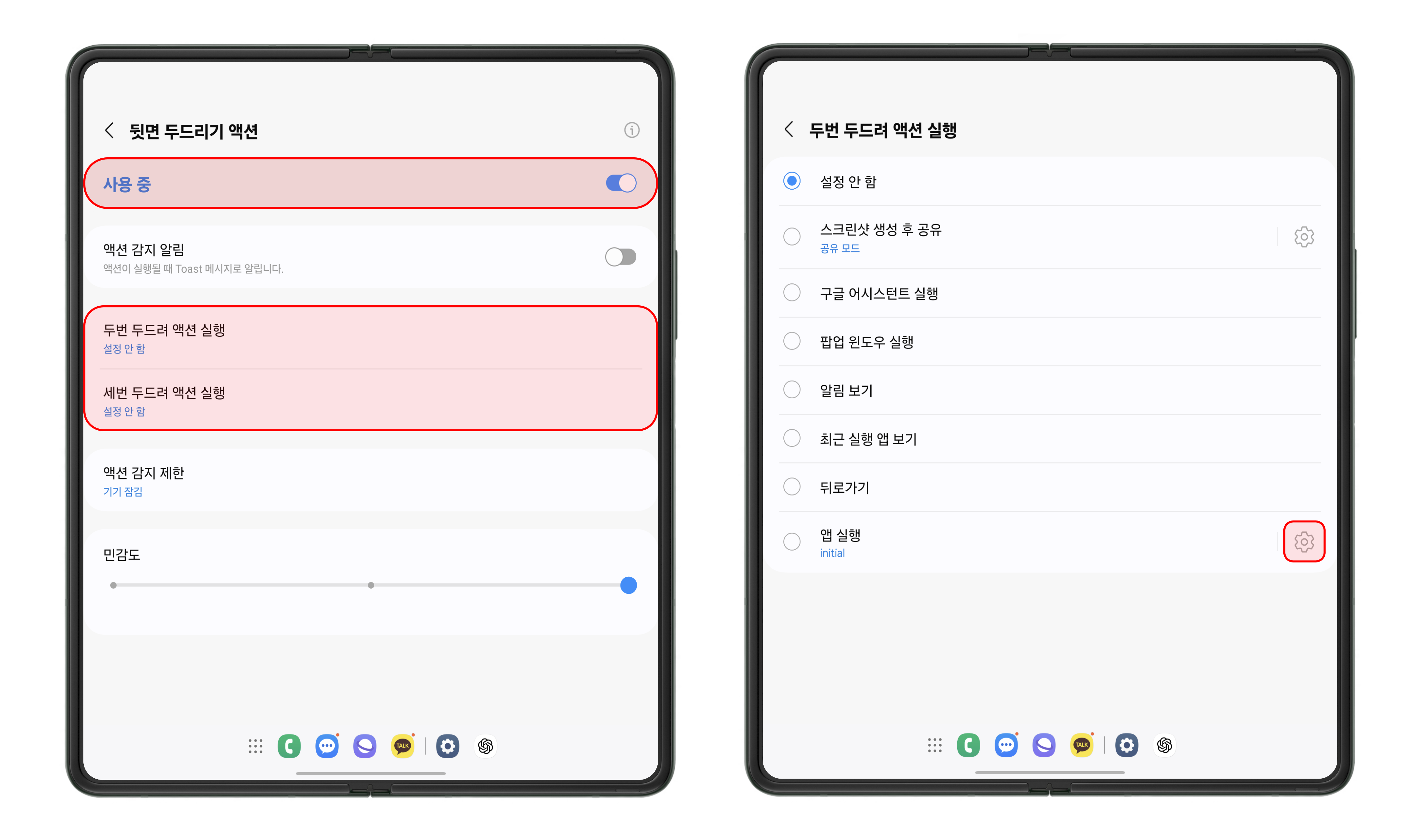 뒷면 두드리기 액션을 사용 중으로 활성화한 후에는 원하는 액션을 선택해 주세요. 두번 및 세번 두드리기 중에 선택이 가능합니다. 다음으로는 해당 액션으로 실행될 앱을 설정하면 되는데, 하단에 있는 앱 실행 메뉴 우측에 있는 설정 버튼을 눌러주세요.