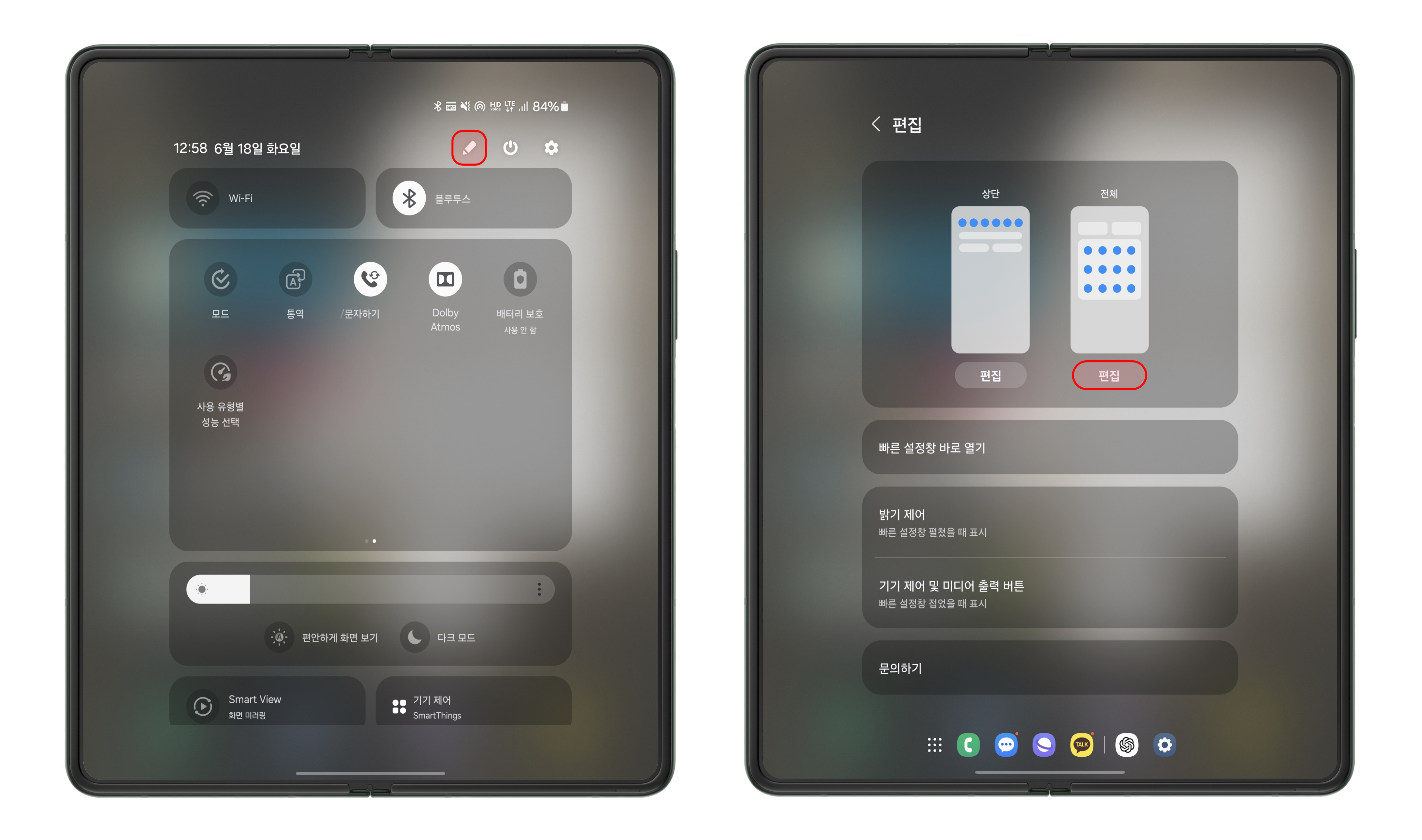 화면 상단을 아래로 내려서 퀵 패널(알림 창)을 실행합니다. 우측 상단의 편집(연필 모양 아이콘) 버튼을 누르고, 전체 편집을 선택해 주세요.
