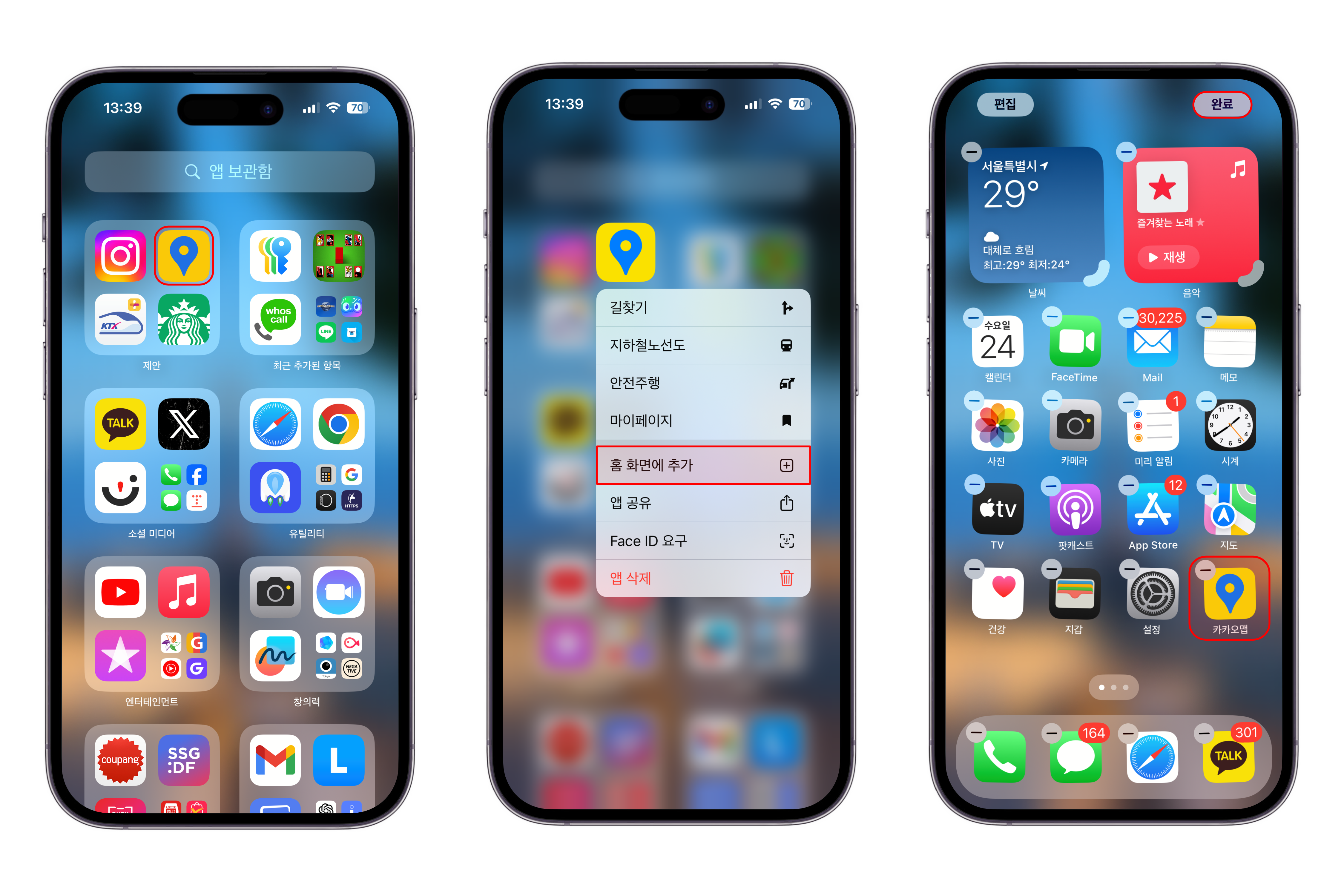 추가적으로, 다시 해당 앱을 홈 화면에 추가하여 사용하고 싶다면, 팝업 메뉴에서 홈 화면에 추가 버튼을 누른 후에 원하는 위치에 다시 배열하여 사용하시면 됩니다.