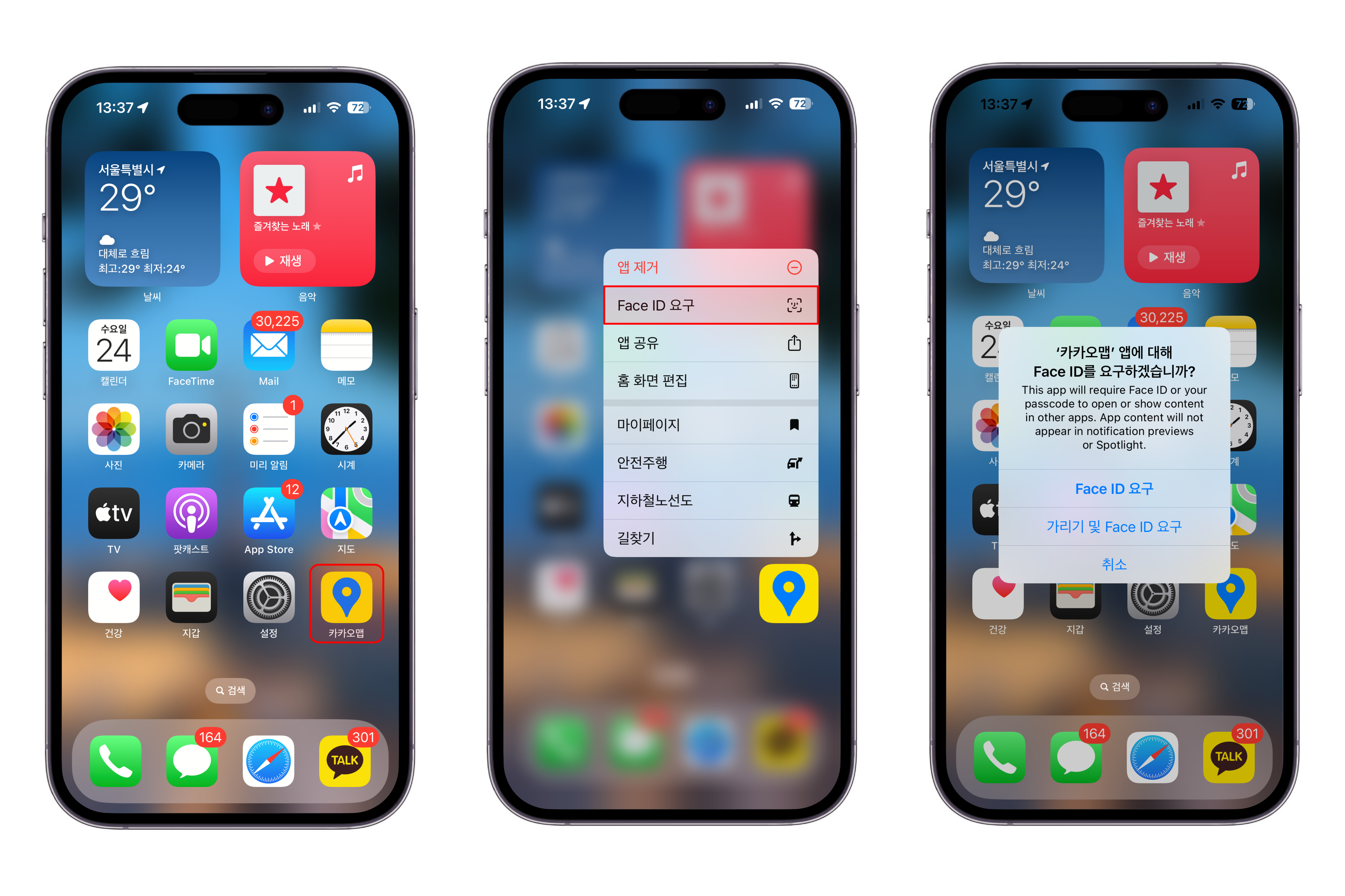 앱을 잠금 후에는 해당 앱 실행 시에 추가적으로 Face ID가 필요로 하는 것을 확인할 수 있습니다.