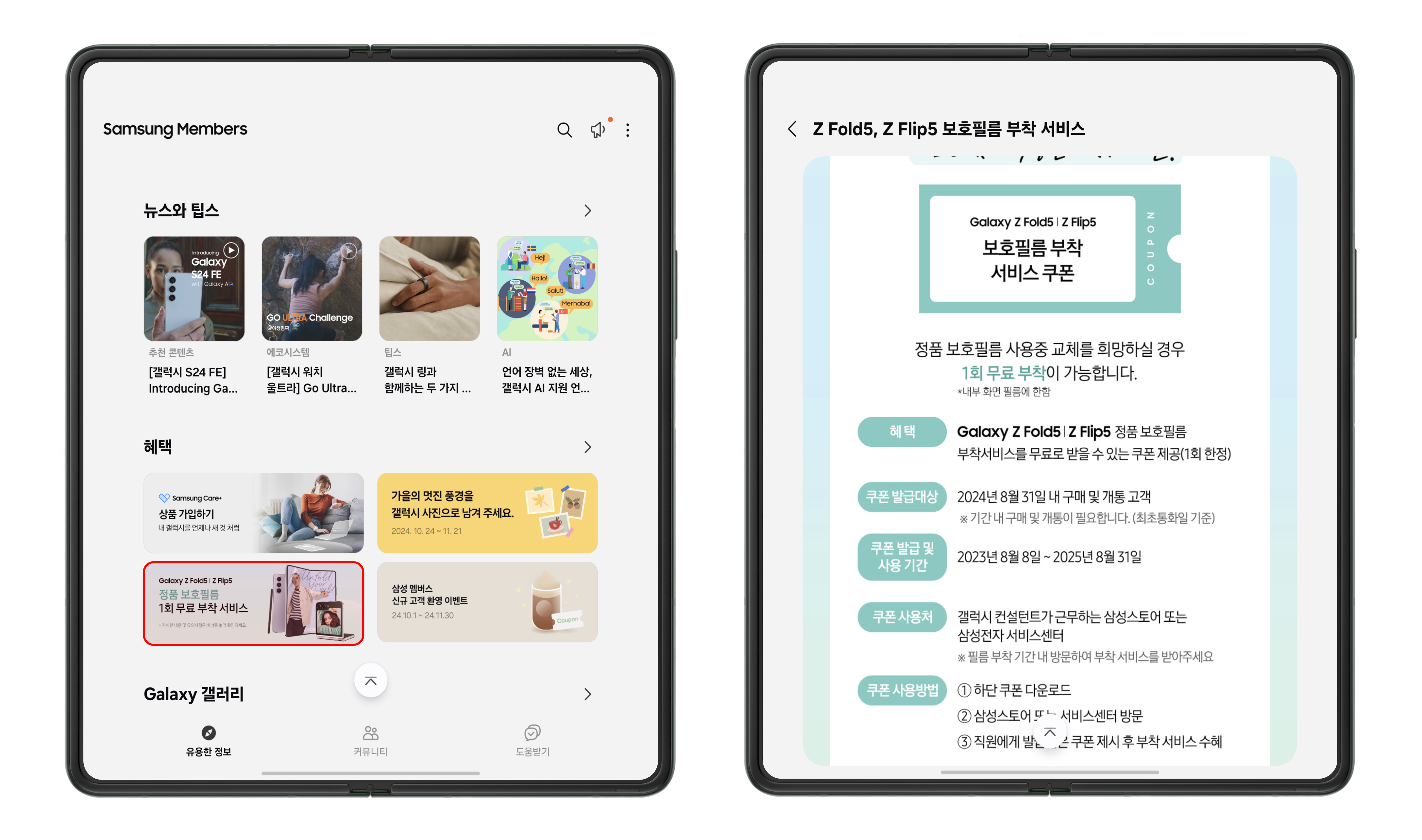 갤럭시 Z 시리즈를 사용하는 분들 중에서 내부 보호 필름을 교체해야 하는 분들은 이번 글을 참고하셔서 삼성전자에서 기본적으로 제공하는 무료 부착 서비스를 사용해 보시는 것을 추천해 드립니다. 기본적으로 쿠폰 발급 및 사용 기간이 정해져 있기 때문에, 삼성 멤버스의 혜택 메뉴에서 해당 내용을 확인한 후에 사용해 보세요.
