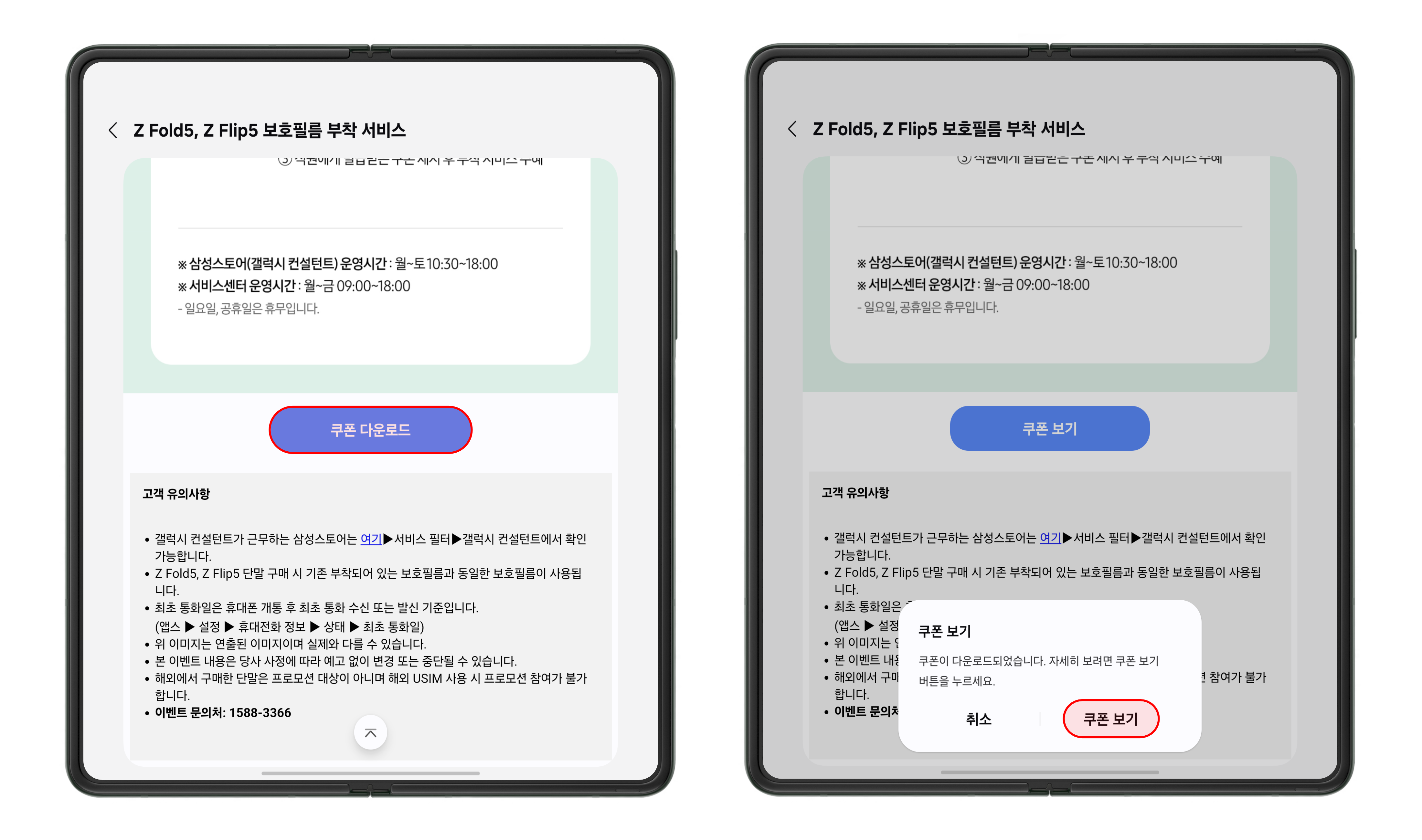 하단으로 내리면 쿠폰 다운로드 버튼이 있는데요. 해당 버튼을 눌러서 쿠폰을 다운로드 받은 후에 갤럭시 컨설턴트가 근무하는 삼성스토어에 방문하여 해당 쿠폰을 보여주고 보호 필름 부착 서비스를 이용하시면 됩니다.