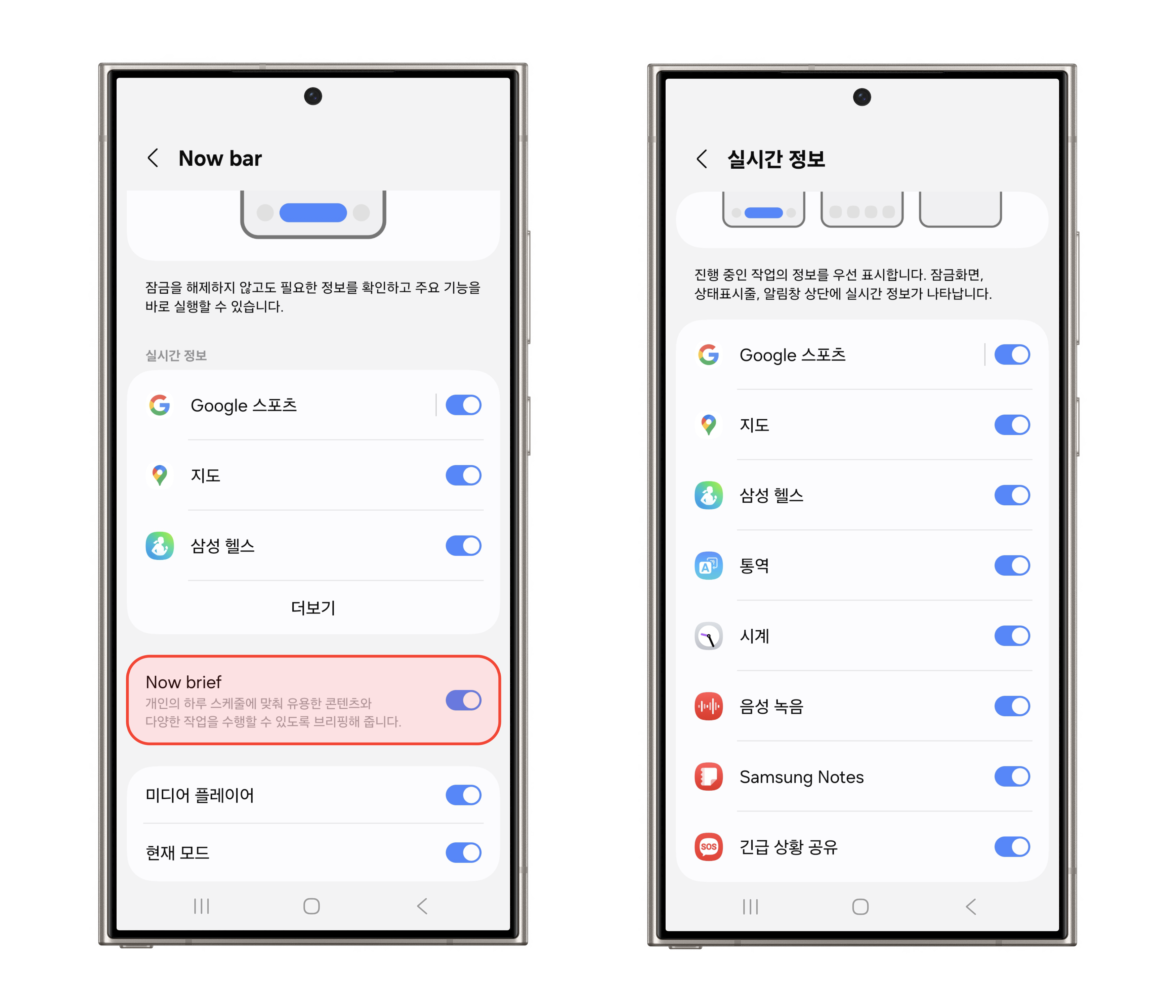 Now bar 설정 페이지에서 Now brief 기능을 활성화할 수 있습니다. 또한, 해당 설정 페이지에서 실시간 정보를 확인할 수 있는 앱을 선택할 수 있는데요. 더 보기 버튼을 누르고, 실시간 정보를 표시할 앱을 선택해 보세요.