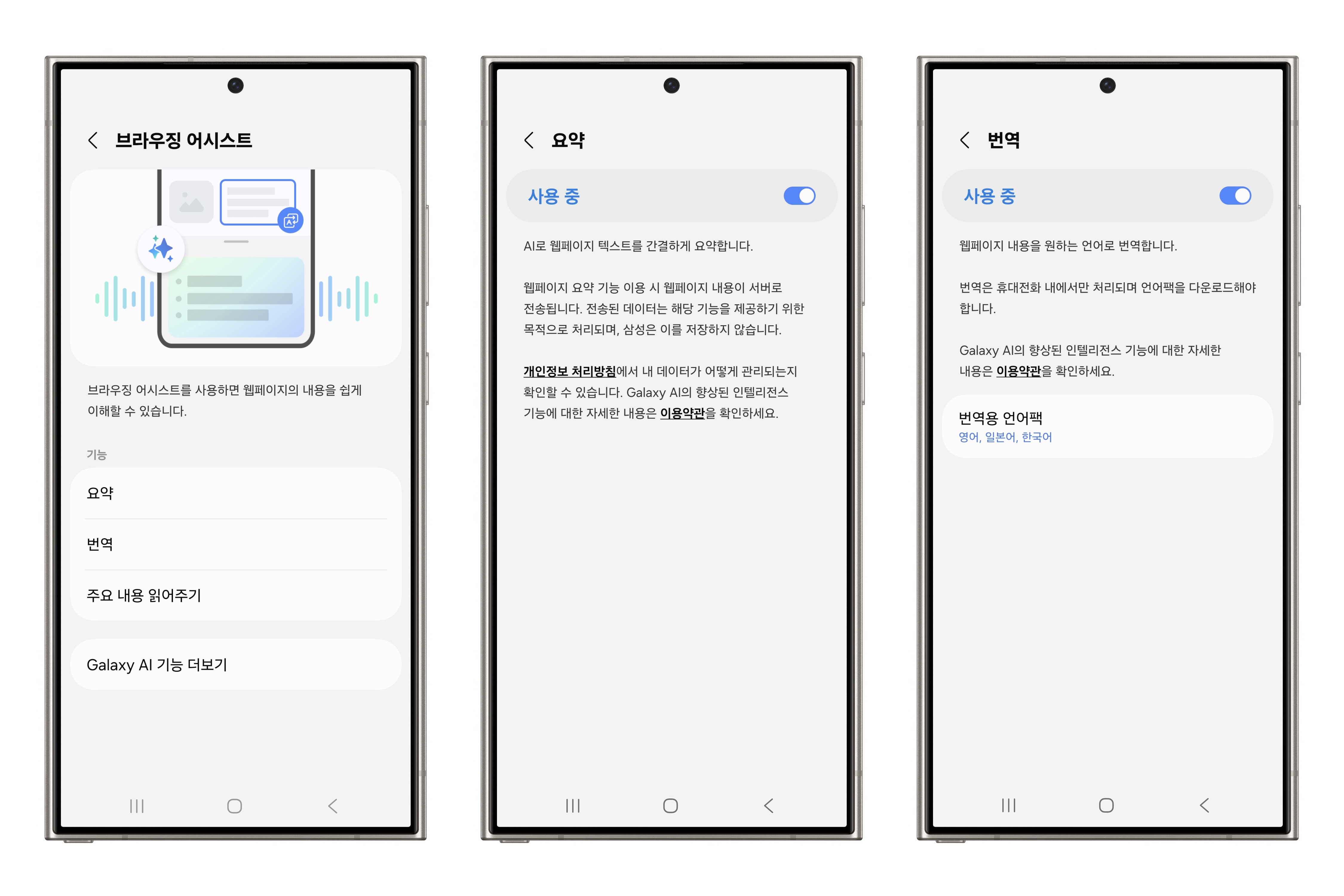 브라우징 어시스트는 요약, 번역, 주요 내용 읽어주기 기능을 제공하는데요. 필요에 따라 각각 원하는 기능을 활성화하여 사용하시면 됩니다. 특히, 번역 기능의 경우에는 기기 내에서만 처리되는 기능이라 별도의 번역용 언어팩 다운로드가 필요하니 참고해 주세요.