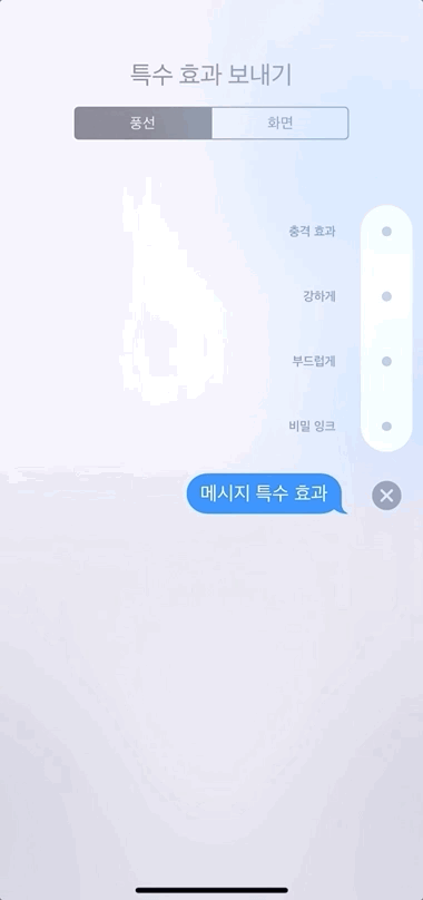iMessage에는 여러 기능이 있는데, 아이폰 X 포함 이후 출시된 모델에서는 애니모티콘을 사용할 수 있으며, Apply pay가 지원되는 곳에서는 Apple Cash를 보낼 수도 있죠. 메시지 전송 특수 효과는 기기 차별 없이, 일정 iOS 버전 이상이면 동일하게 사용할 수 있습니다.