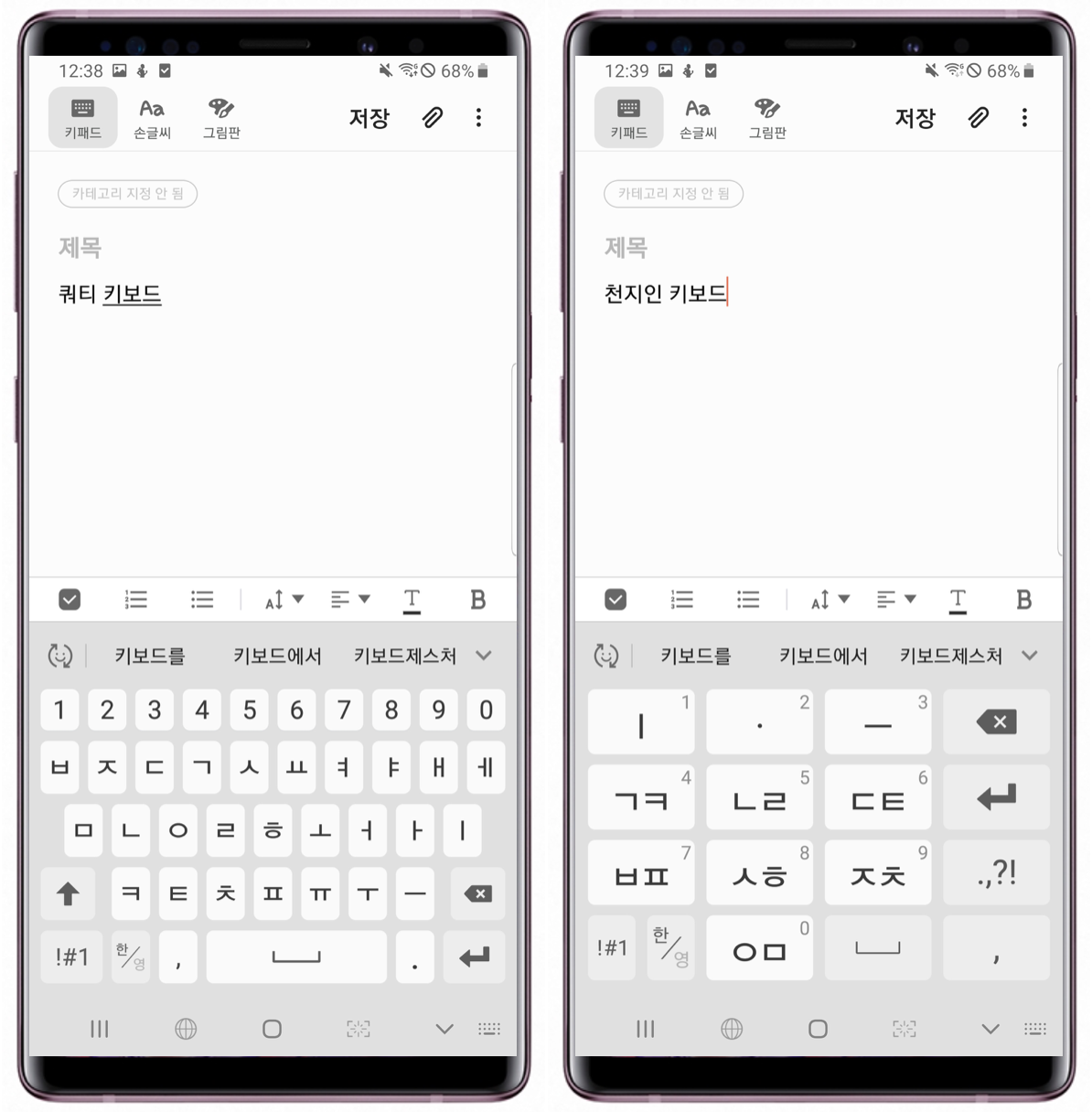 삼성 키보드는 기본적으로 6개의 배열 중에 선택 가능하며, 추가적으로 써드 파티 키보드를 사용하고 싶다면, 별도로 설정해줘야 합니다. (아 래 사진은 쿼티 키보드와 천지인 키보드 비교)