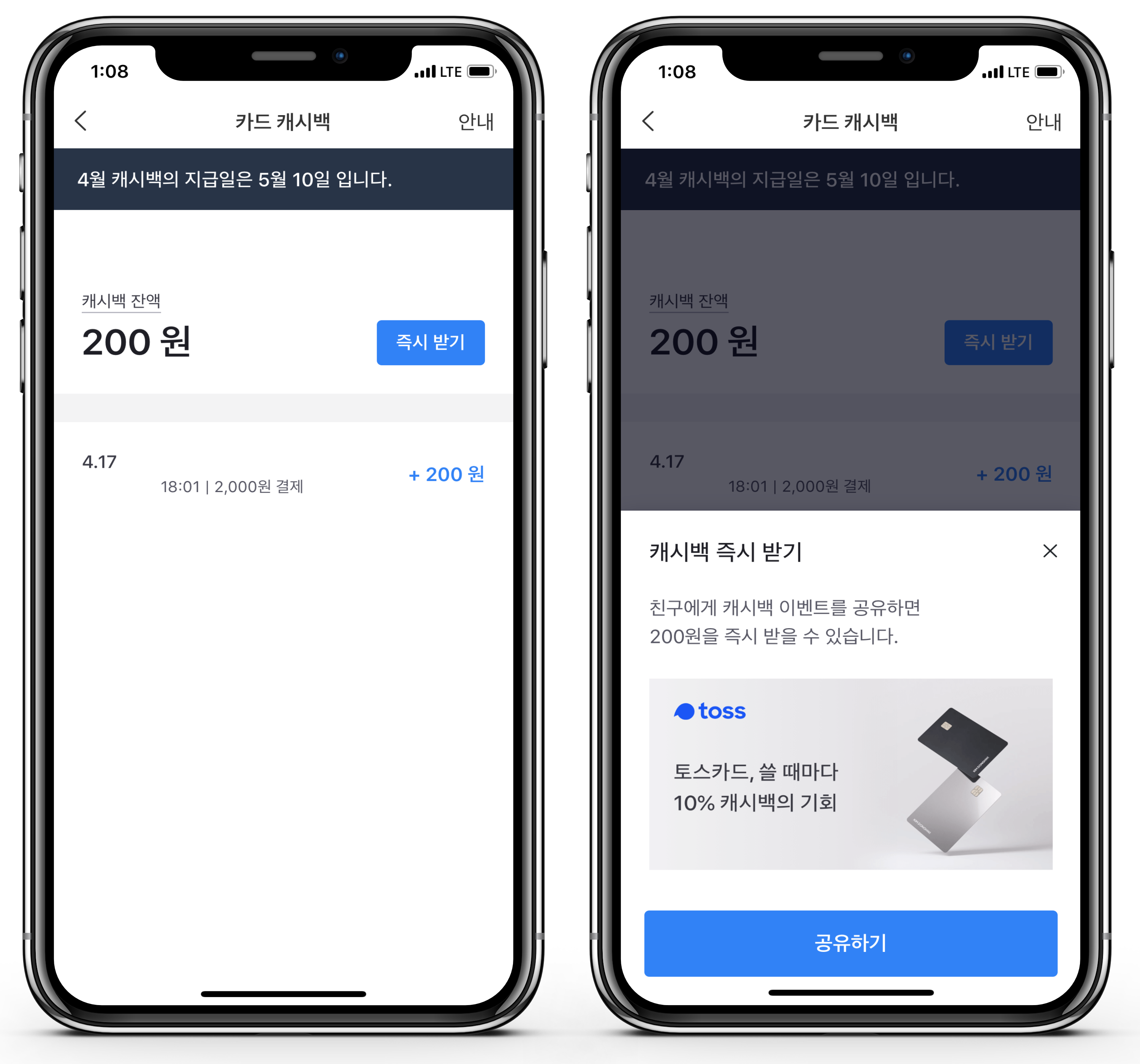 저는 처음 카드를 받아서 등록 여부를 확인하기 위해 결제를 해봤는데, 바로 당첨이 되었습니다. 캐시백은 기본적으로 다음 달에 적립이 되며, 친구에게 이벤트 공유 시 바로 적립해주는 것 같아요.
