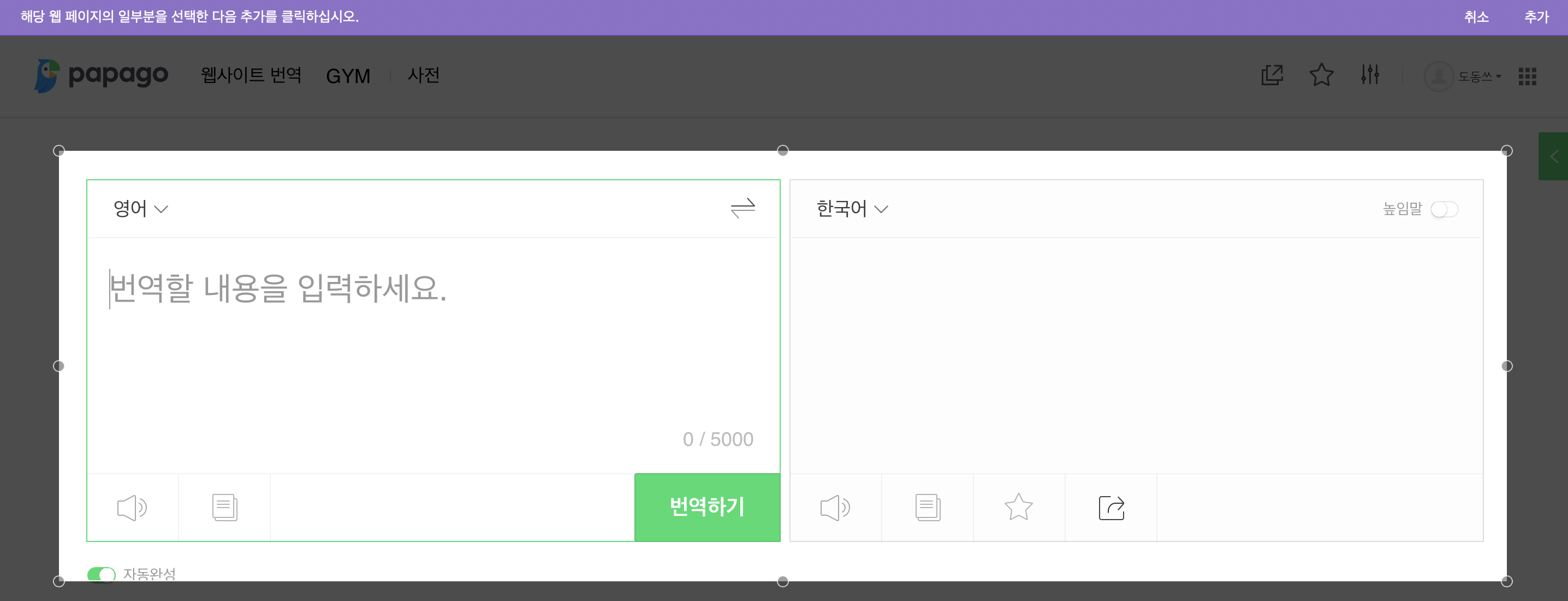 웹사이트를 통해 이용할 수 있는 맞춤법 검사기 및 번역기를 Dashboard에 추가해서 사용할 수 있는데요. 페이지의 원하는 부분을 자르고, Dashboard에 추가해서 사용할 수 있다고 생각하면 쉬울 것 같습니다.