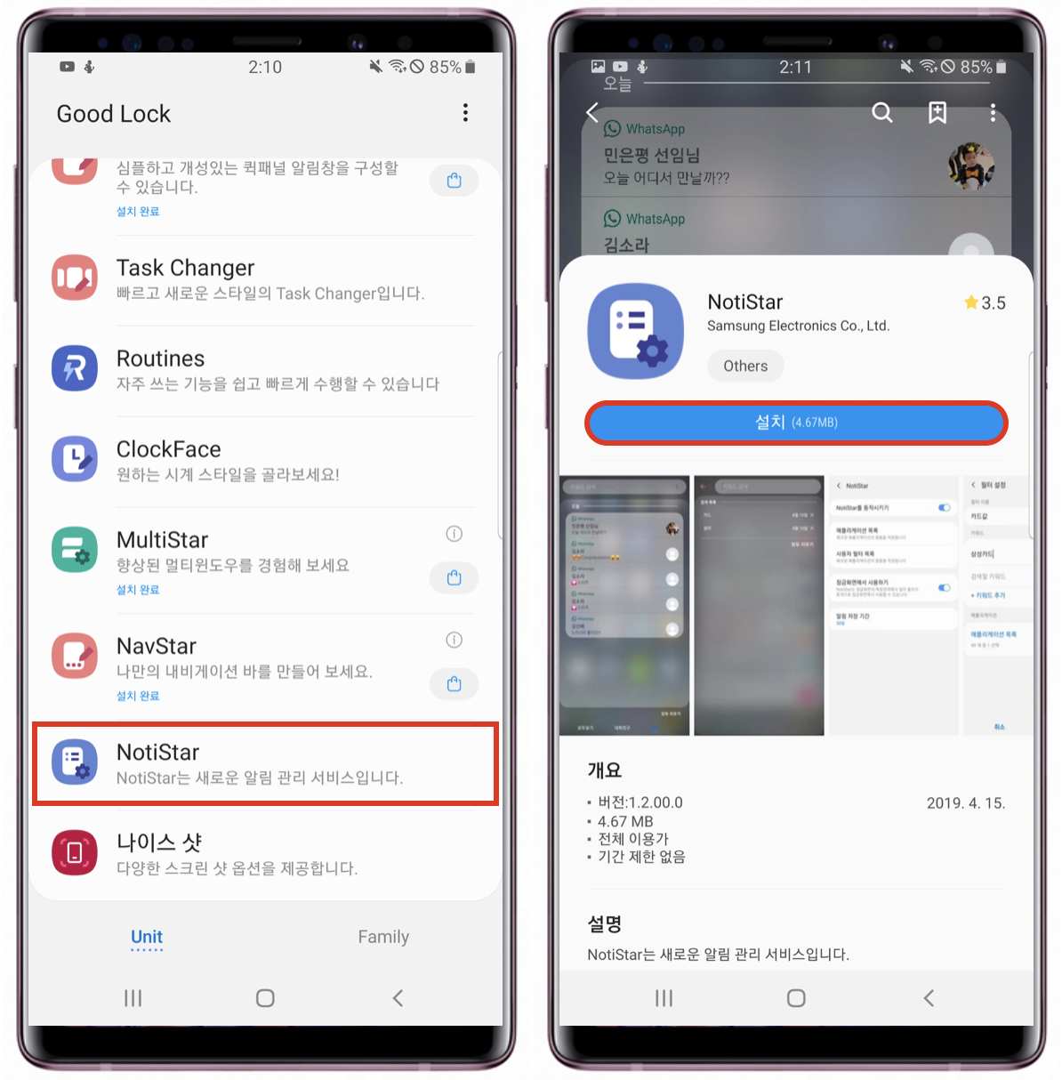 NotiStar를 사용하기 위해서는 Galaxy Store에서 굿락(GoodLock) 앱을 설치해야 합니다. 굿락을 설치한 후, 하단으로 내려서 NotiStar 플러그인을 추가로 다운로드 받으면 준비는 끝이 납니다.