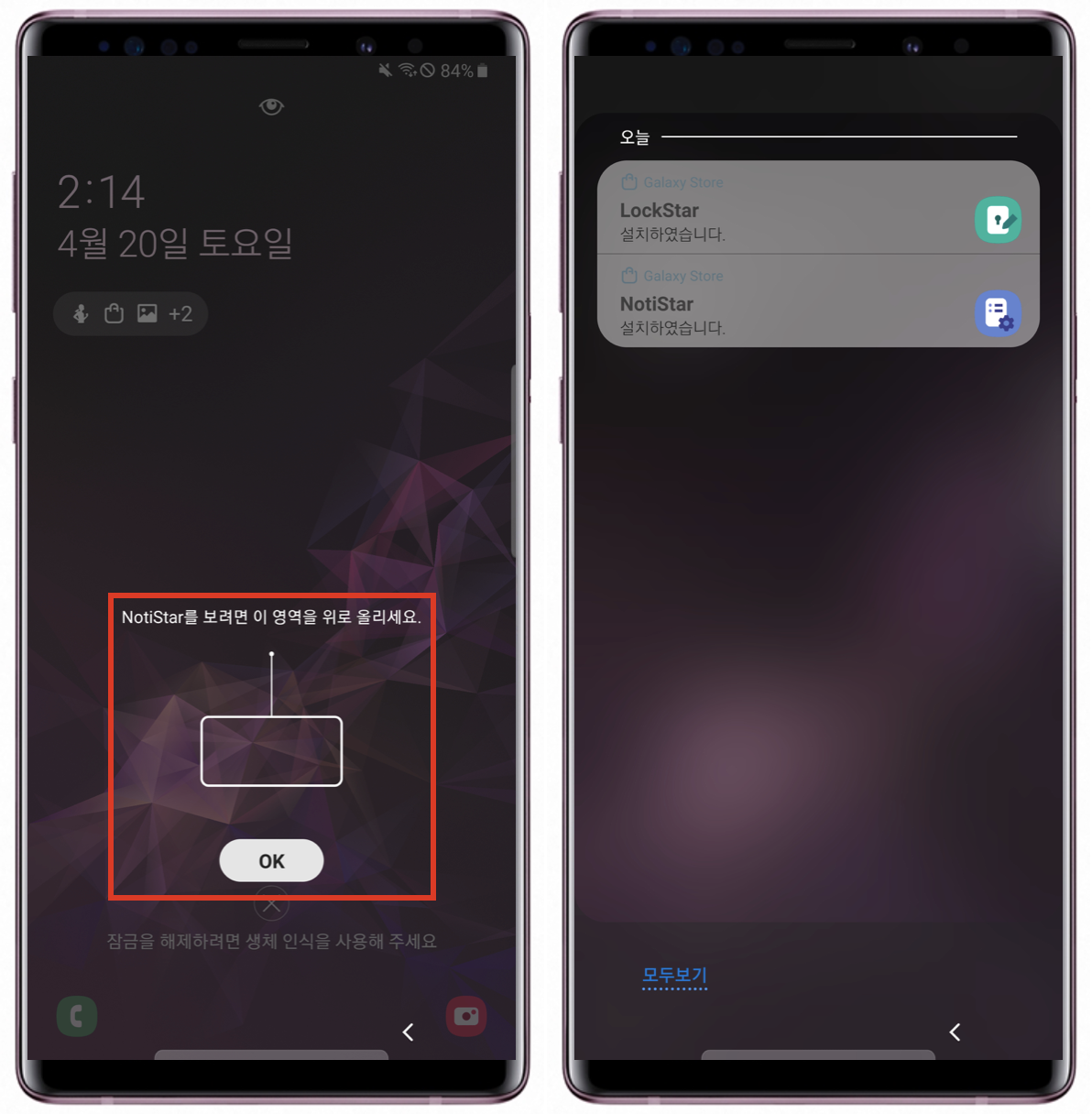 잠금 화면에서 사용하기를 활성화하면, 아래와 같이 잠금 화면의 일정 부분을 위로 스와이프 해서 NotiStar를 바로 실행해서 사용할 수 있습니다.