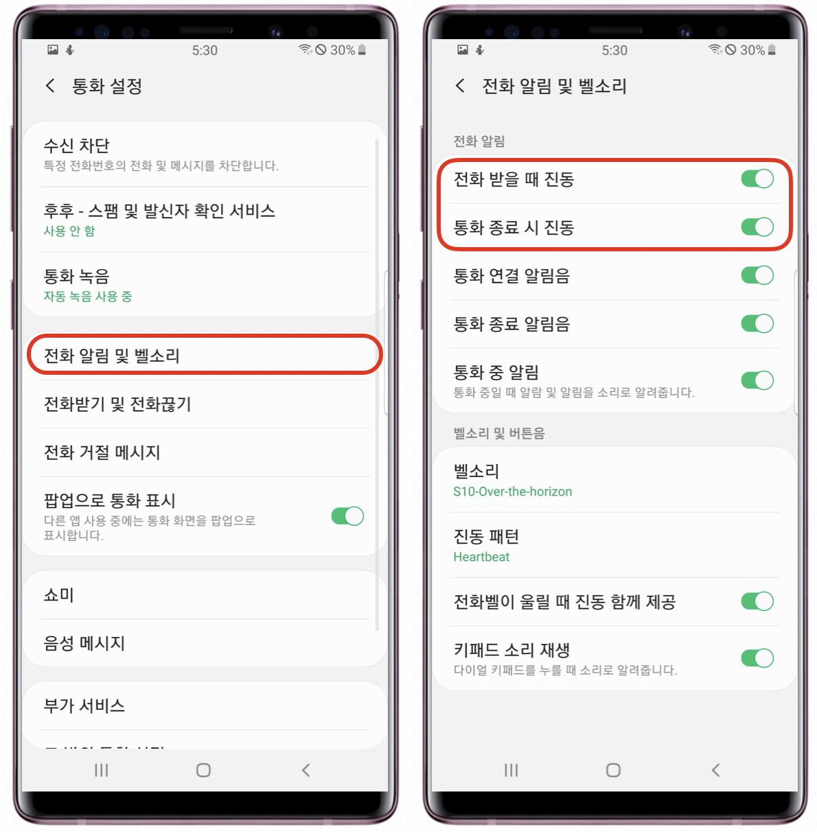 - 전화 설정에서 전화 알림 및 벨소리 탭으로 들어가서 전화 알림의 진동 기능을 활성화하면 됩니다.