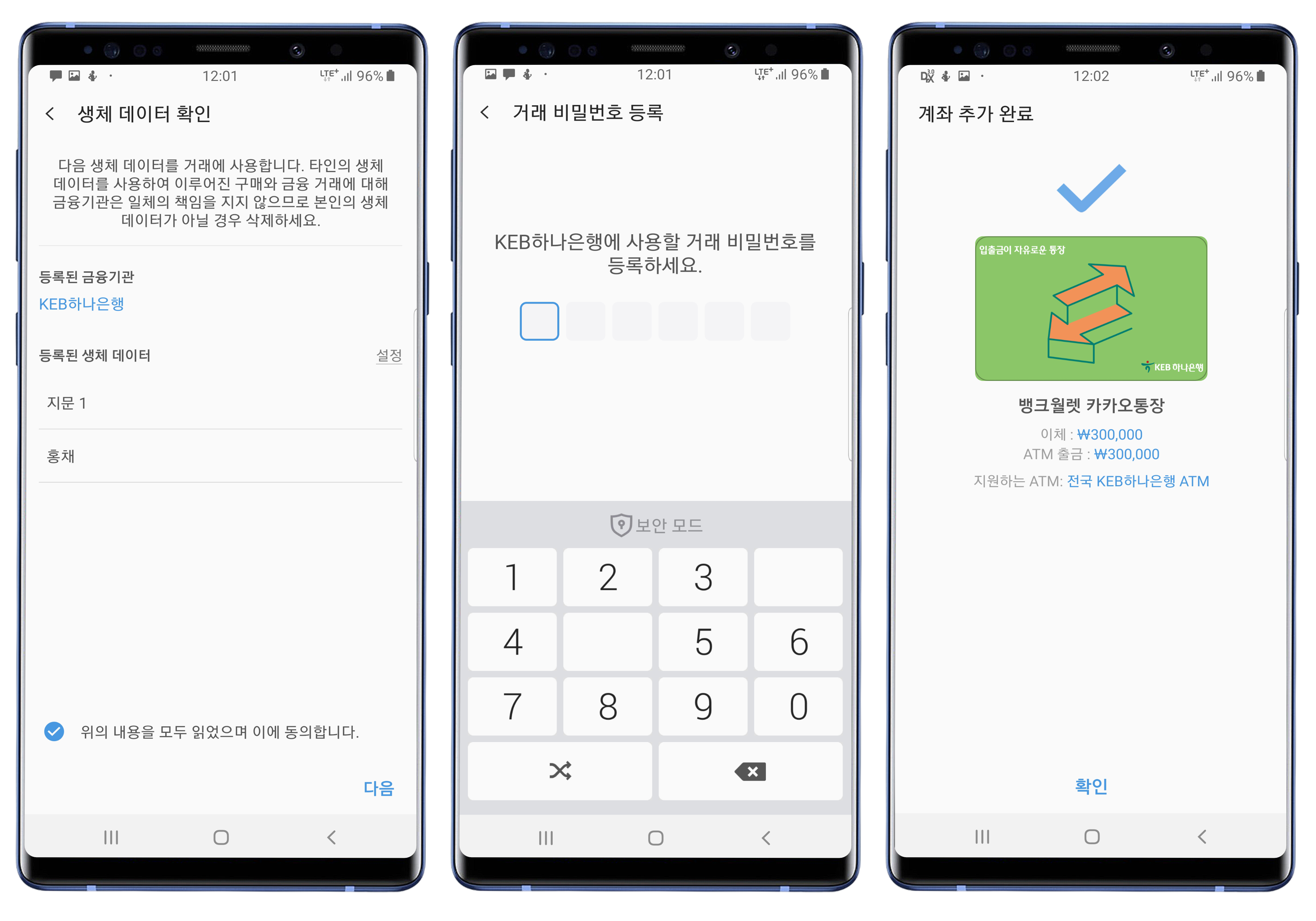 생체 데이터 및 삼성페이에서 거래 시 사용할 비밀번호 등을 등록하면 계좌 추가가 완료됩니다.