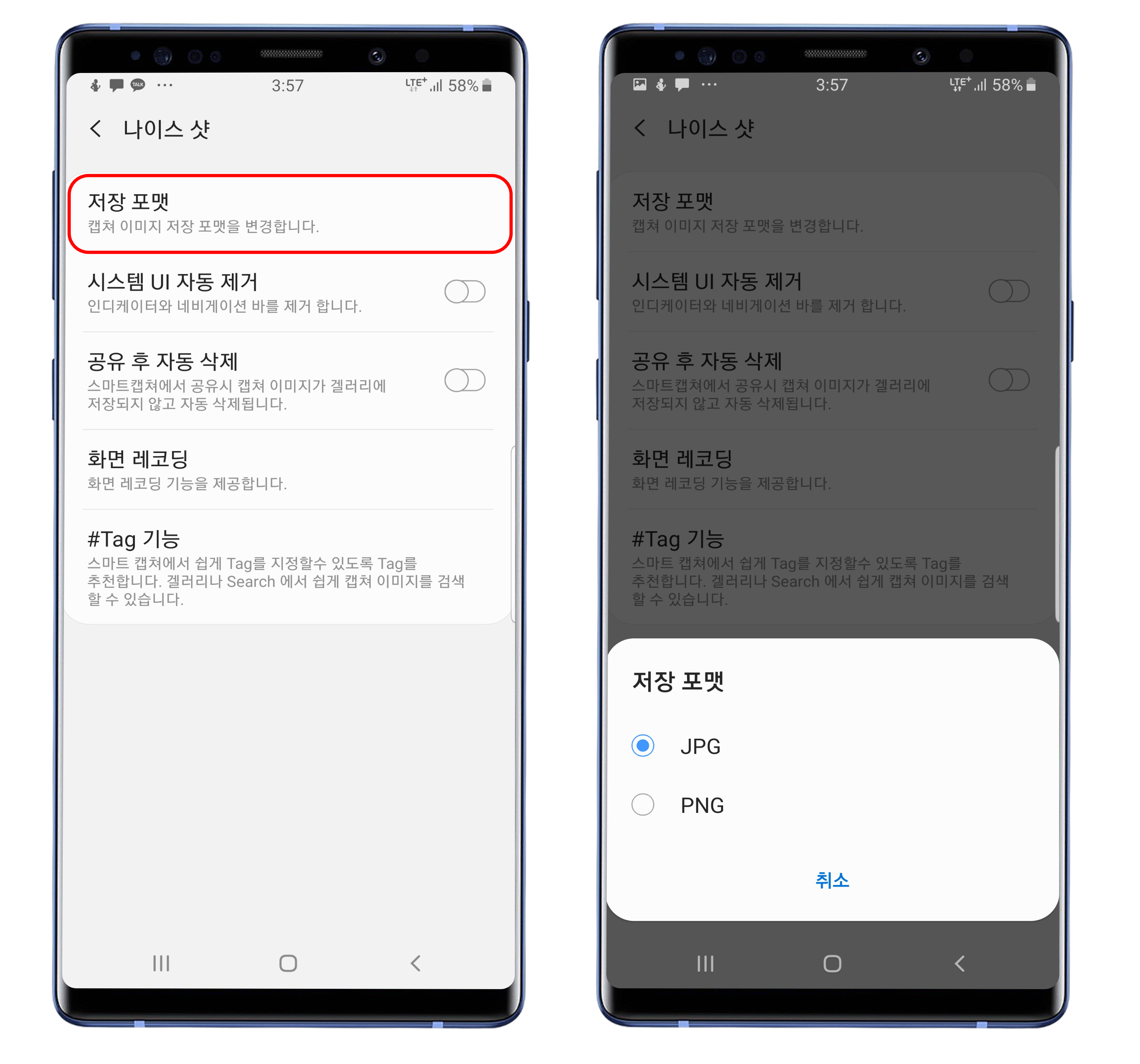 - 스크린 샷의 저장 포맷을 JPG(기본) 또는 PNG로 변경 가능.