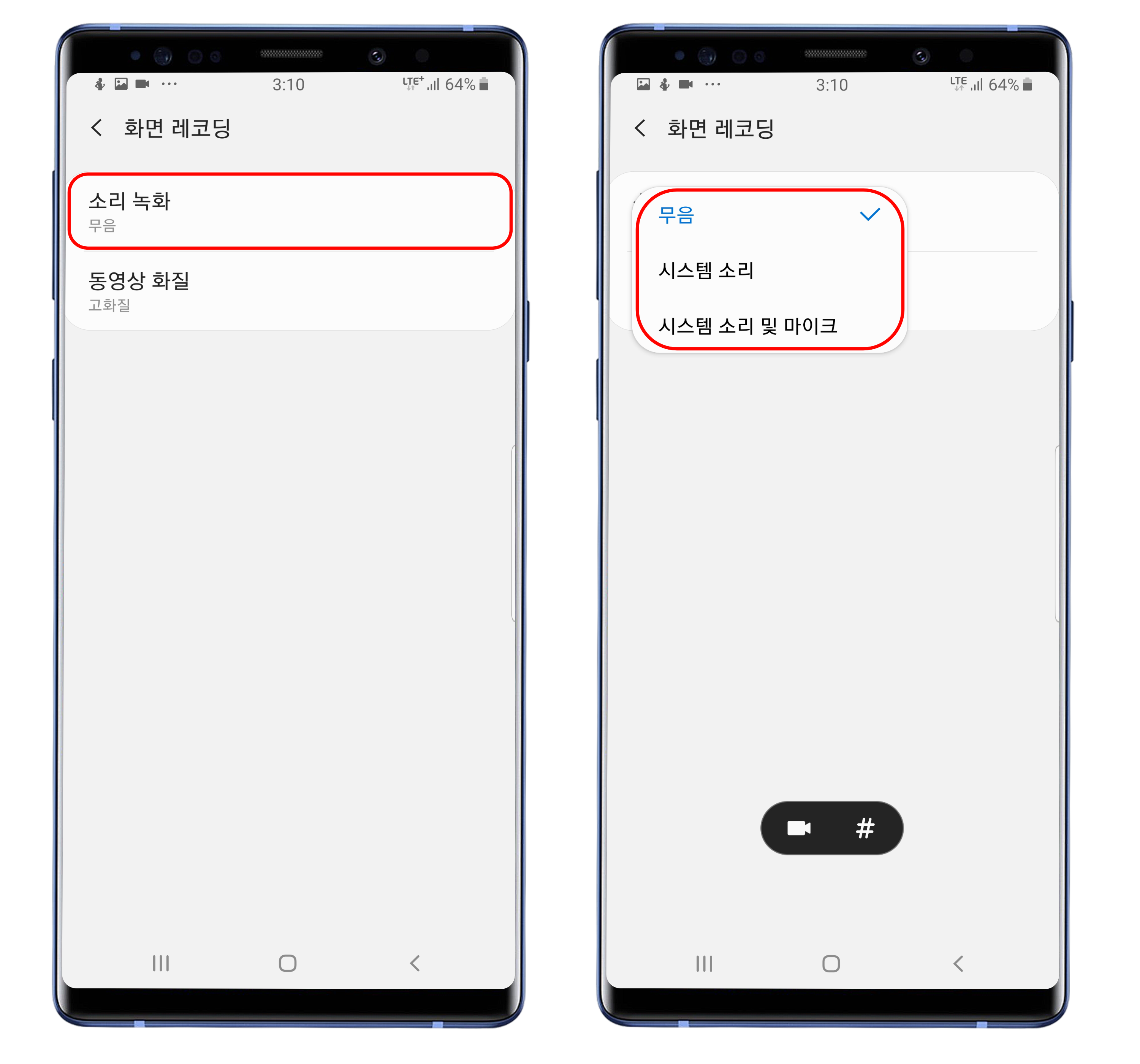 - 화면 레코딩 설정에서는 영상의 소리 및 품질을 설정할 수 있습니다.