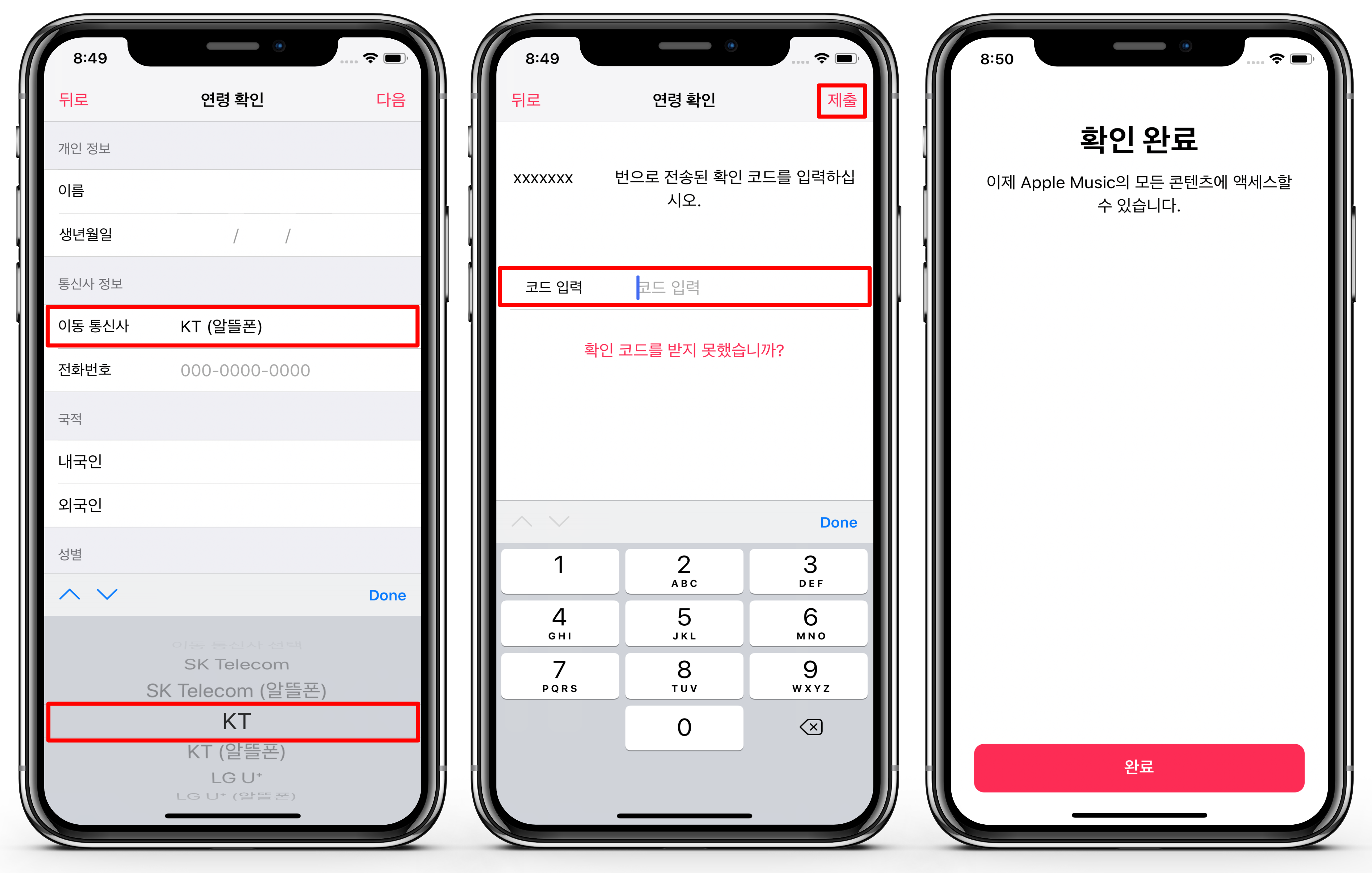 - 정보를 입력한 후, 휴대폰으로 전송된 확인 코드를 입력하여 제출합니다.
