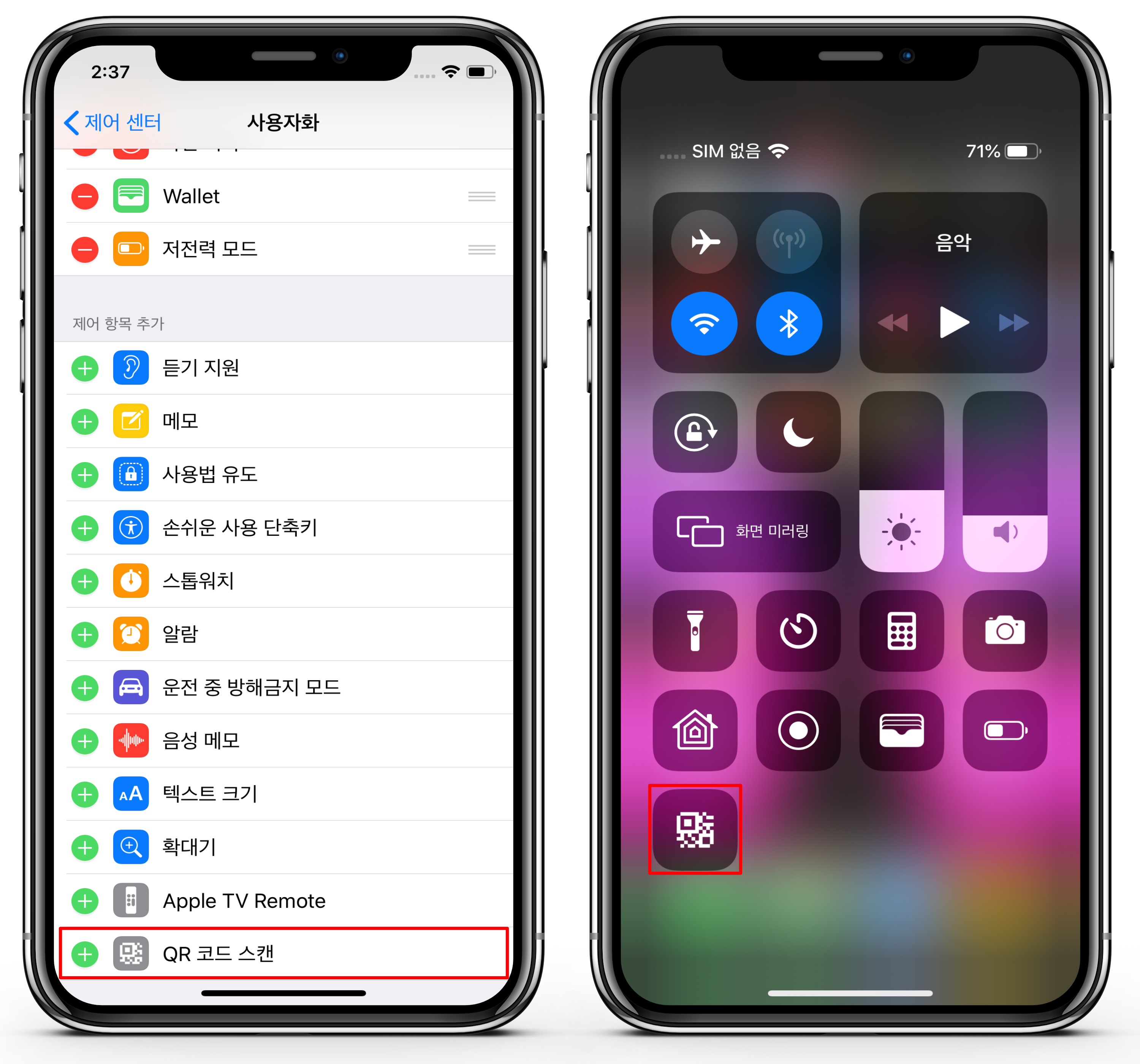 제어 센터 사용자화에서 QR 코드 스캔 기능을 추가한 후, 제어 센터에서 빠르게 사용해보세요.