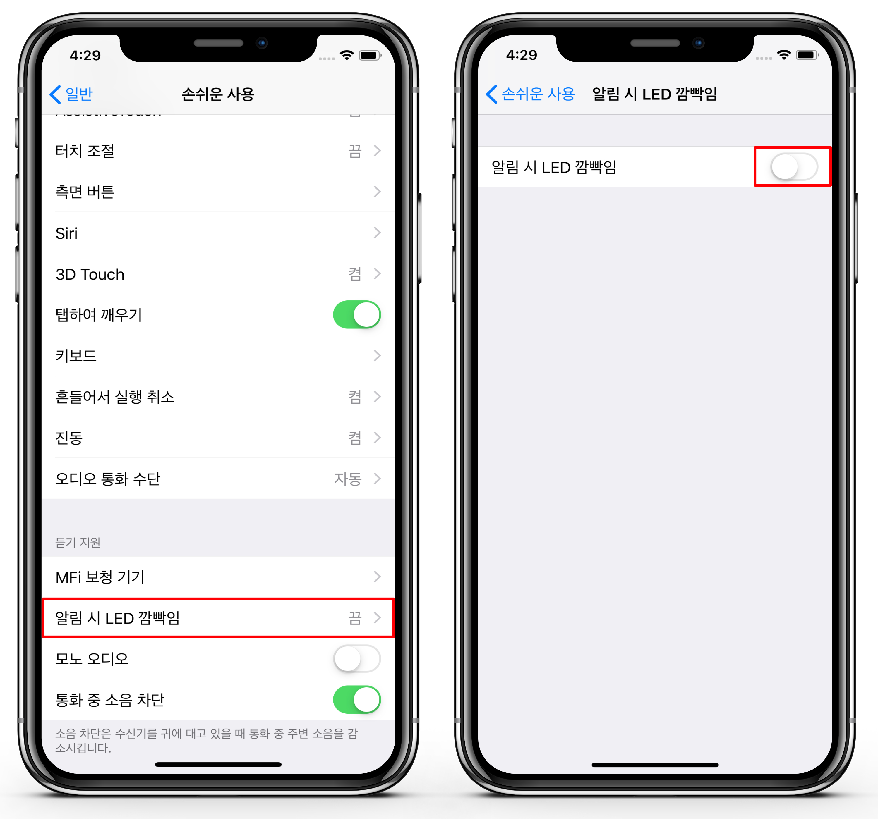 손쉬운 사용 설정에서 하단 듣기 지원 탭에 있는 알림 시 LED 깜빡임을 누른 후에 활성화합니다.