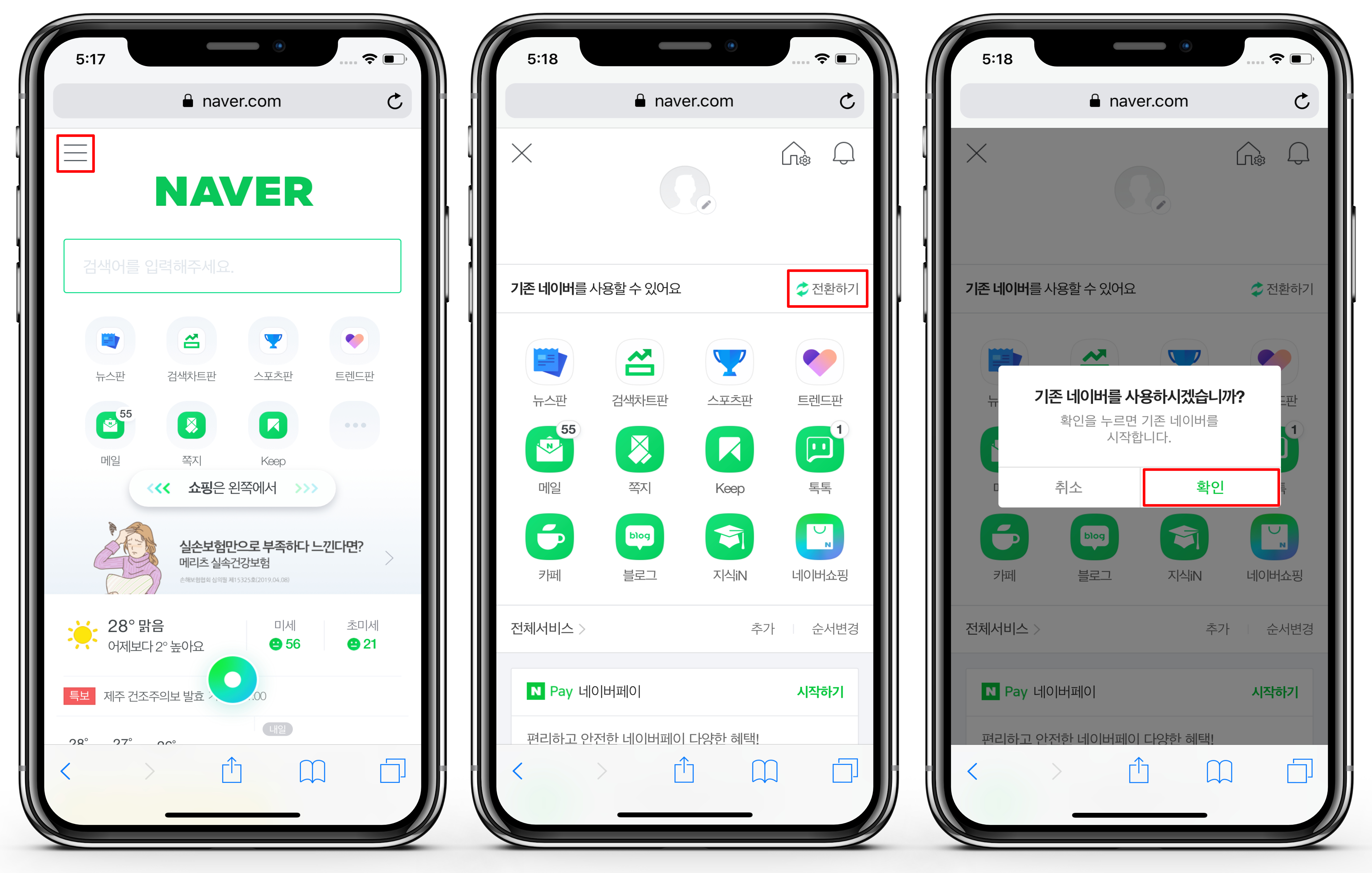 메뉴를 누르고 프로필 하단에 있는 전환하기 버튼을 눌러 기존의 네이버로 변경합니다.