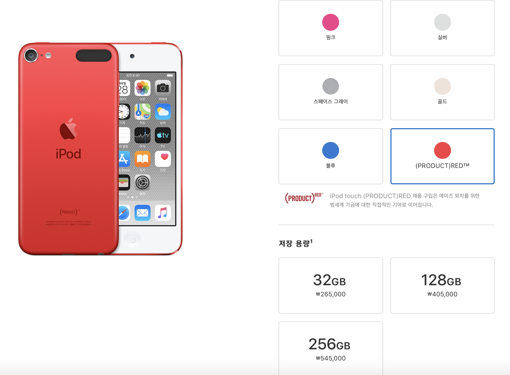 핑크, 실버, 스페이스 그레이, 골드, 블루, 레드 총 6가지 색상이 있으며, 저장 공간은 32GB, 128GB, 256GB로 각각 26만 5천원, 40만 5천원, 54만 6천원으로 출시될 예정이라고 합니다. 이번 아이팟 터치에는 3.5mm 이어폰 단자가 살아 있어서 그 점은 마음에 듭니다.