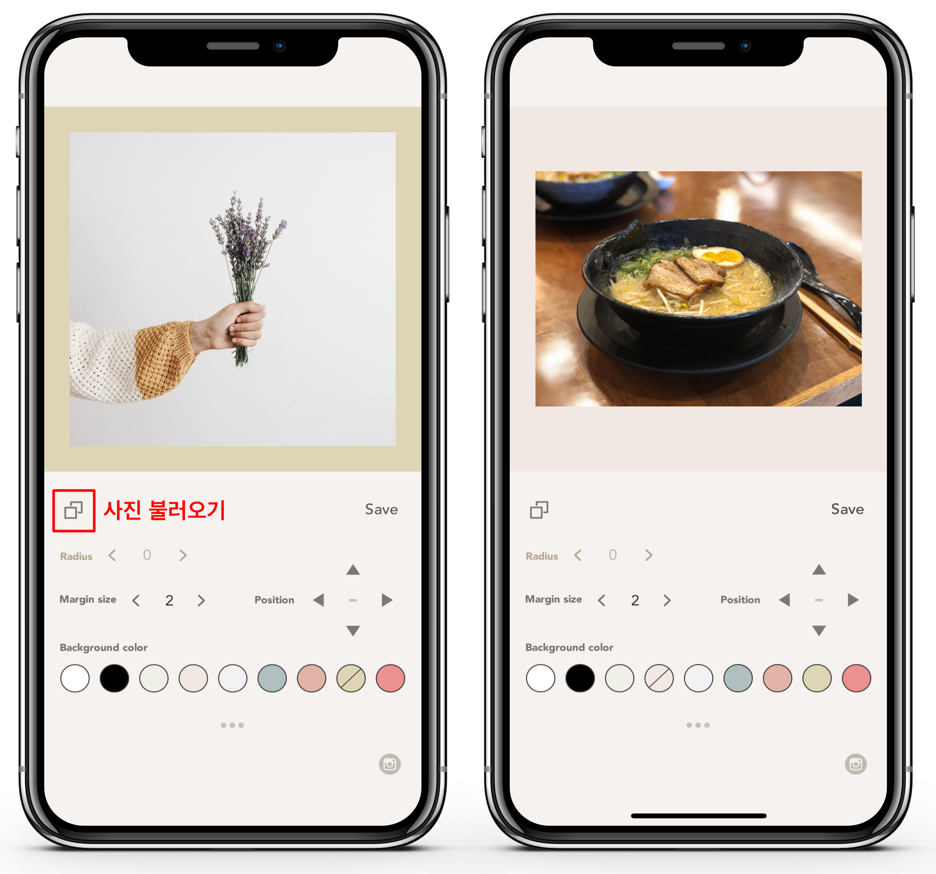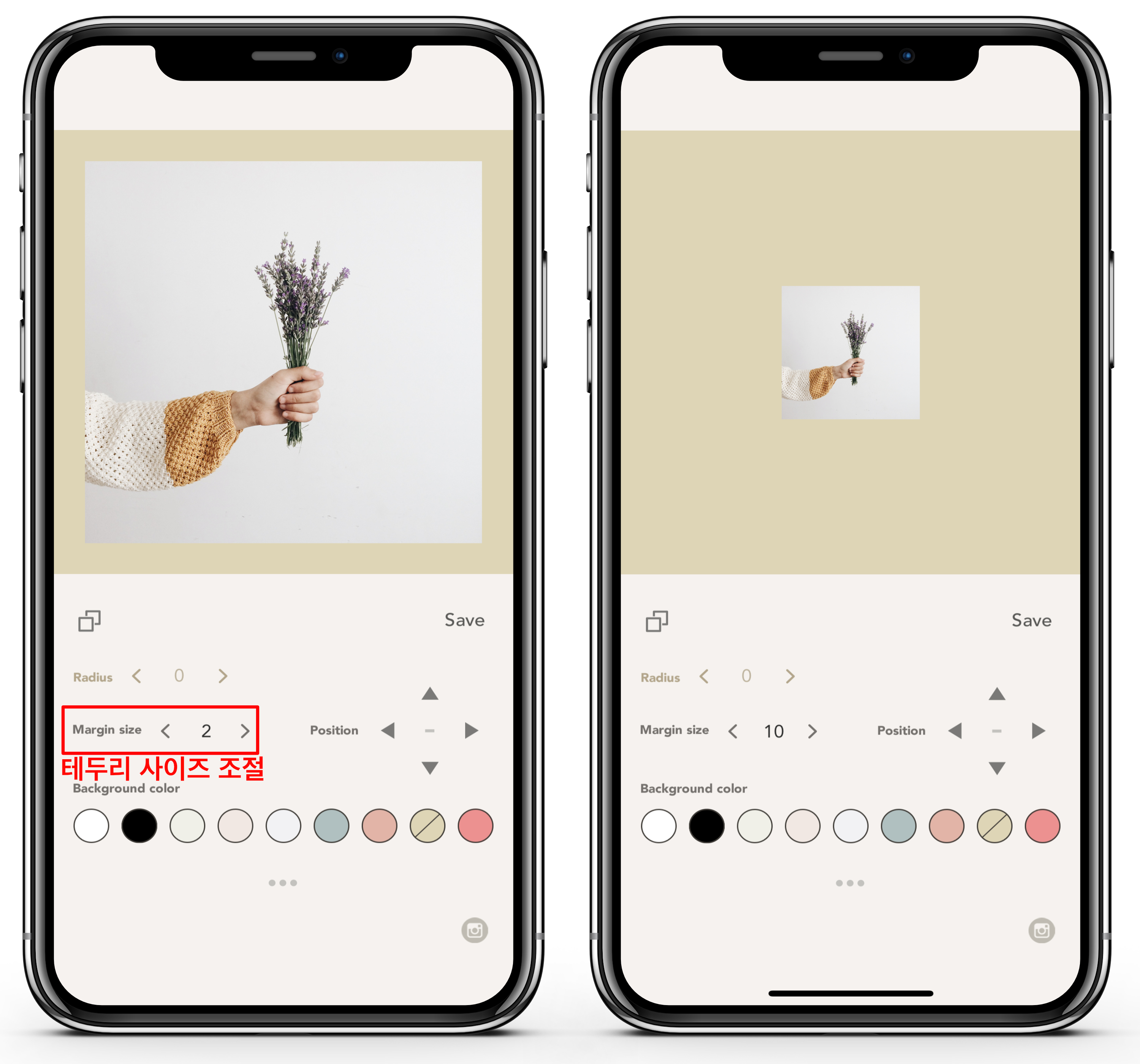 Margin size를 조절하여 테두리 넓이를 변경할 수 있습니다. 인스타 피드의 분위기에 맞게 사용하면 될 것 같아요.