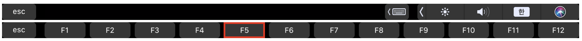 터치바 모델의 경우에는 터치바에 앱 제어기가 기본값으로 되어있는데요. 논 터치바 모델과 동일하게 fn 키를 누르고 있으면 터치바에 펑션 키가 활성화되니, 동일한 방법으로 새로 고침을 사용할 수 있습니다.