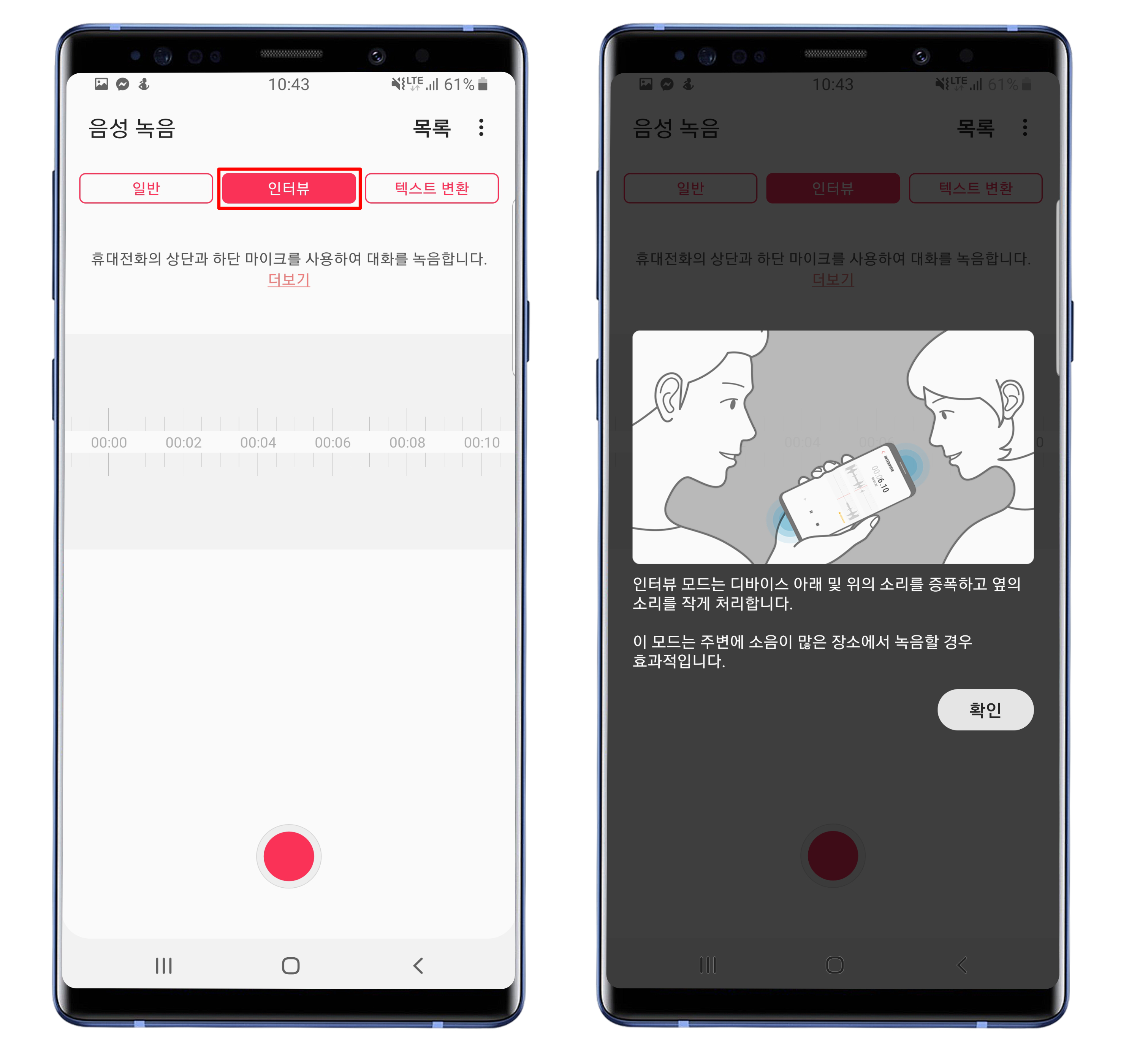인터뷰 기능은 주변에 잡음이 많을 때 사용하면 좋다고 합니다. 상단 및 하단의 방향에 따라 소리 증폭이 다르니, 이것을 생각하시고 활용하면 좋을 것 같습니다.