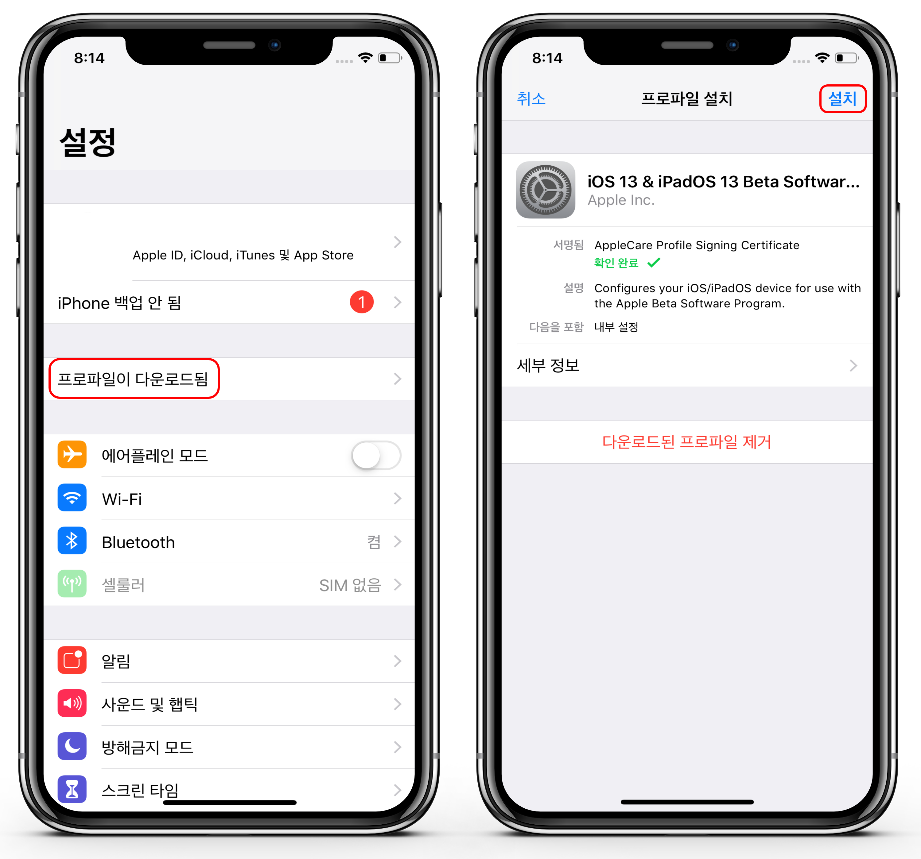 프로파일을 다운로드 받았다면, 설정을 실행한 후에 프로파일이 다운로드됨을 누르고 설치하시면 됩니다.