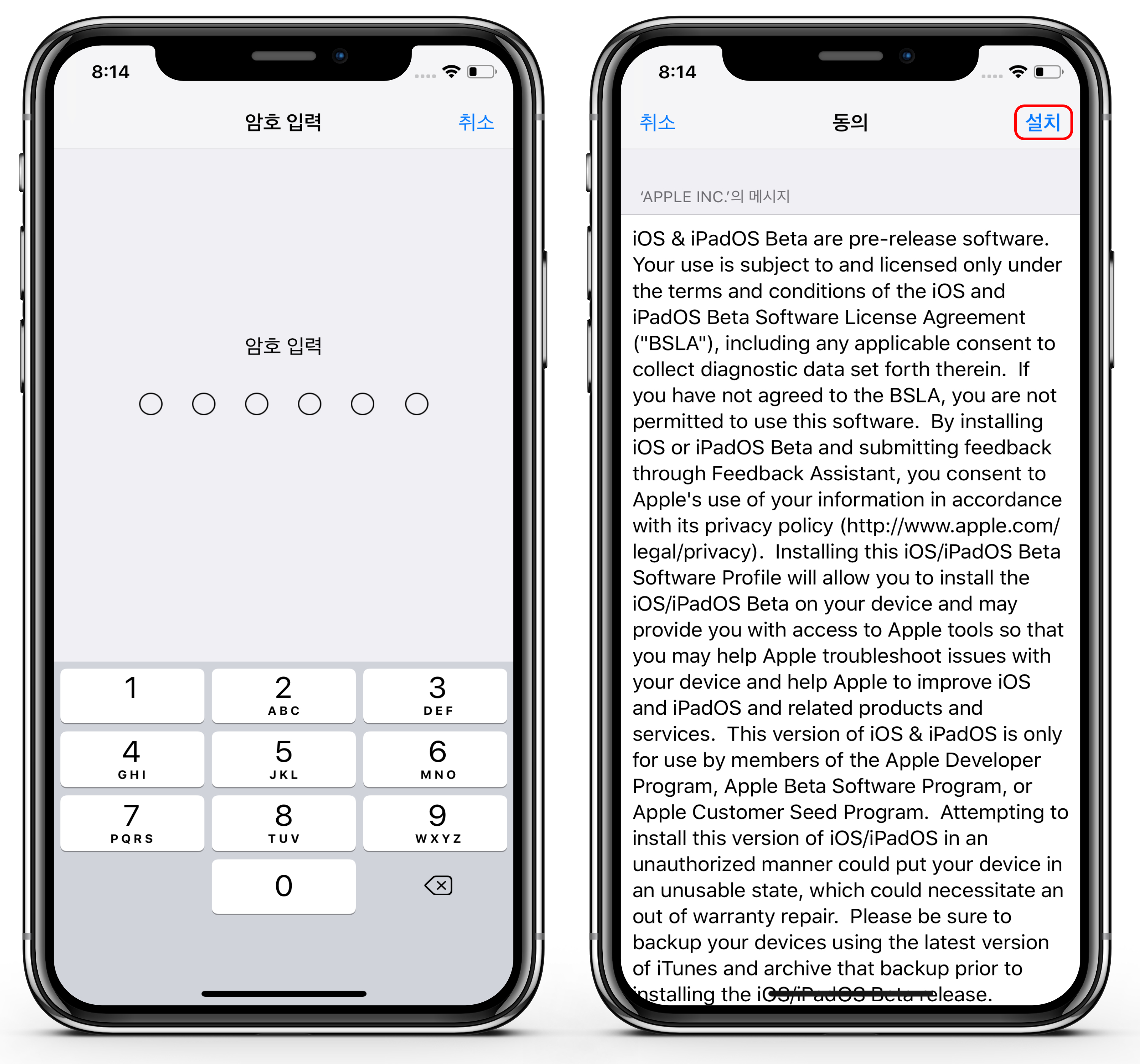휴대폰 암호를 입력한 후, 설치를 누르면 프로파일 설치가 완료됩니다.