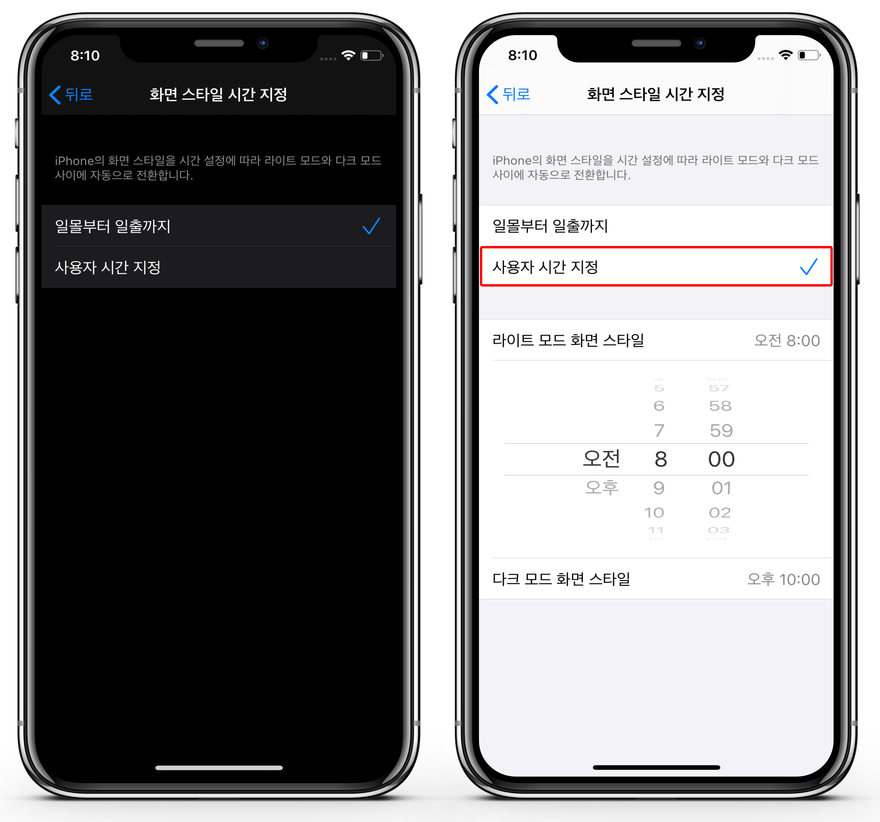 다크 모드를 사용할 때, 배경화면 설정에 있는 배경화면을 어둡게 만드는 기능을 사용해보세요. 제가 현재 계속 사용해보고 있는데, 큰 차이는 없는 것 같습니다. (배경에 따라 결과는 달라질 수 있을 것 같아요)