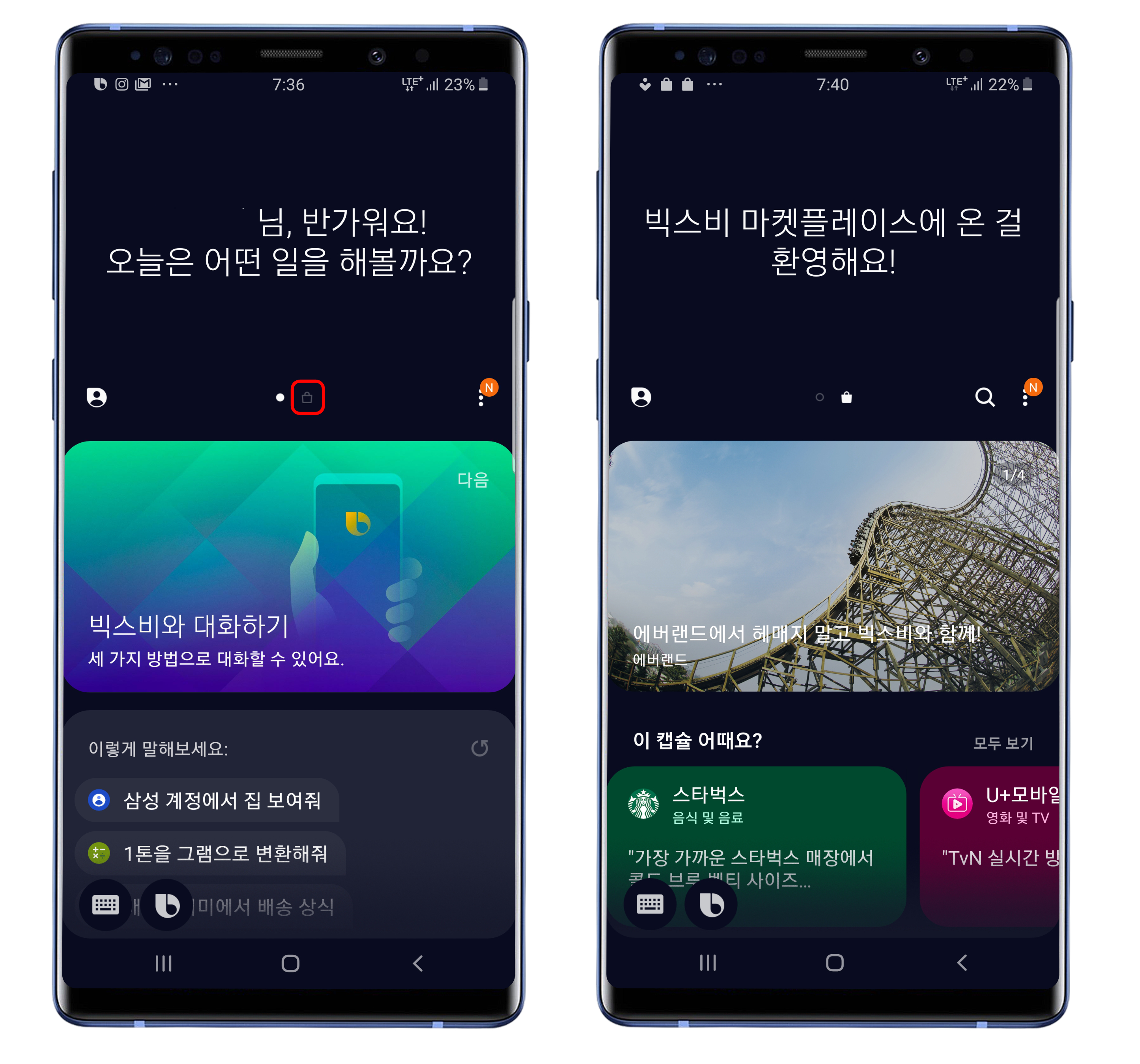 빅스비를 실행한 후, 아래의 사진에 표시된 아이콘을 누르거나 왼쪽으로 화면을 넘기면 빅스비 마켓플레이스에 들어갈 수 있습니다.