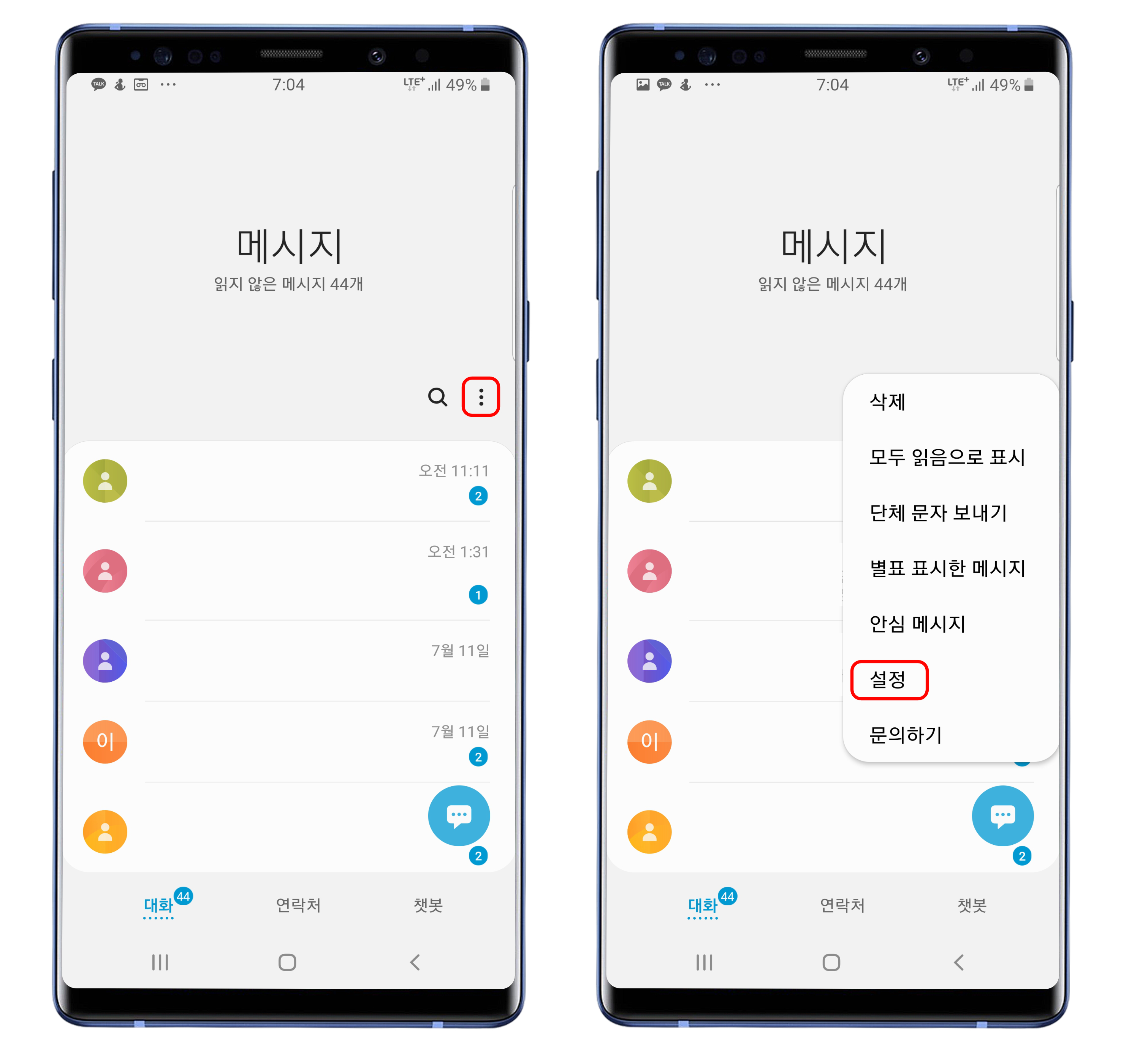 메시지를 실행한 후, 우측의 더 보기를 눌러서 설정으로 진입합니다.