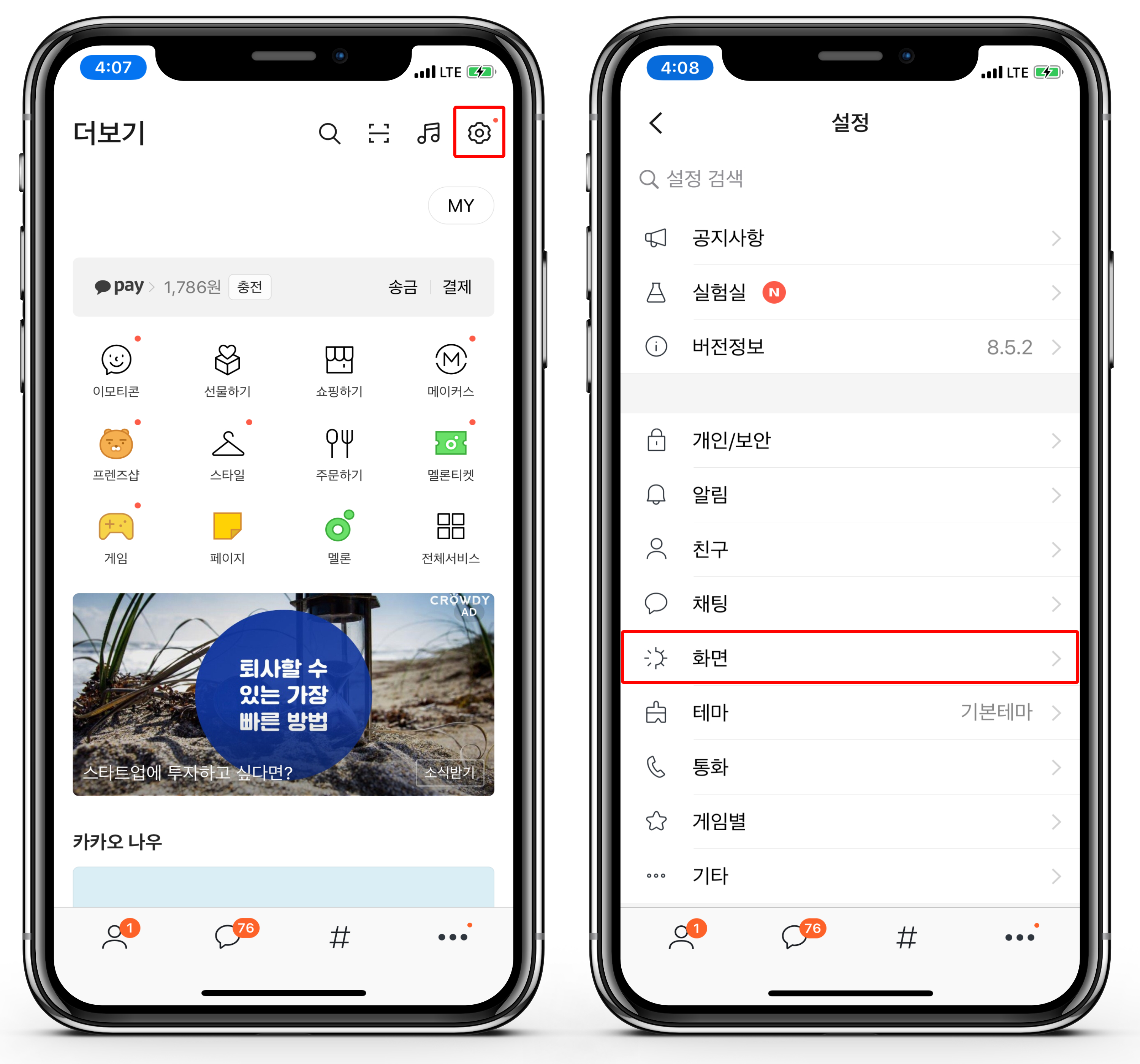 - 더 보기 탭에서 우측 상단에 있는 설정으로 진입하세요.