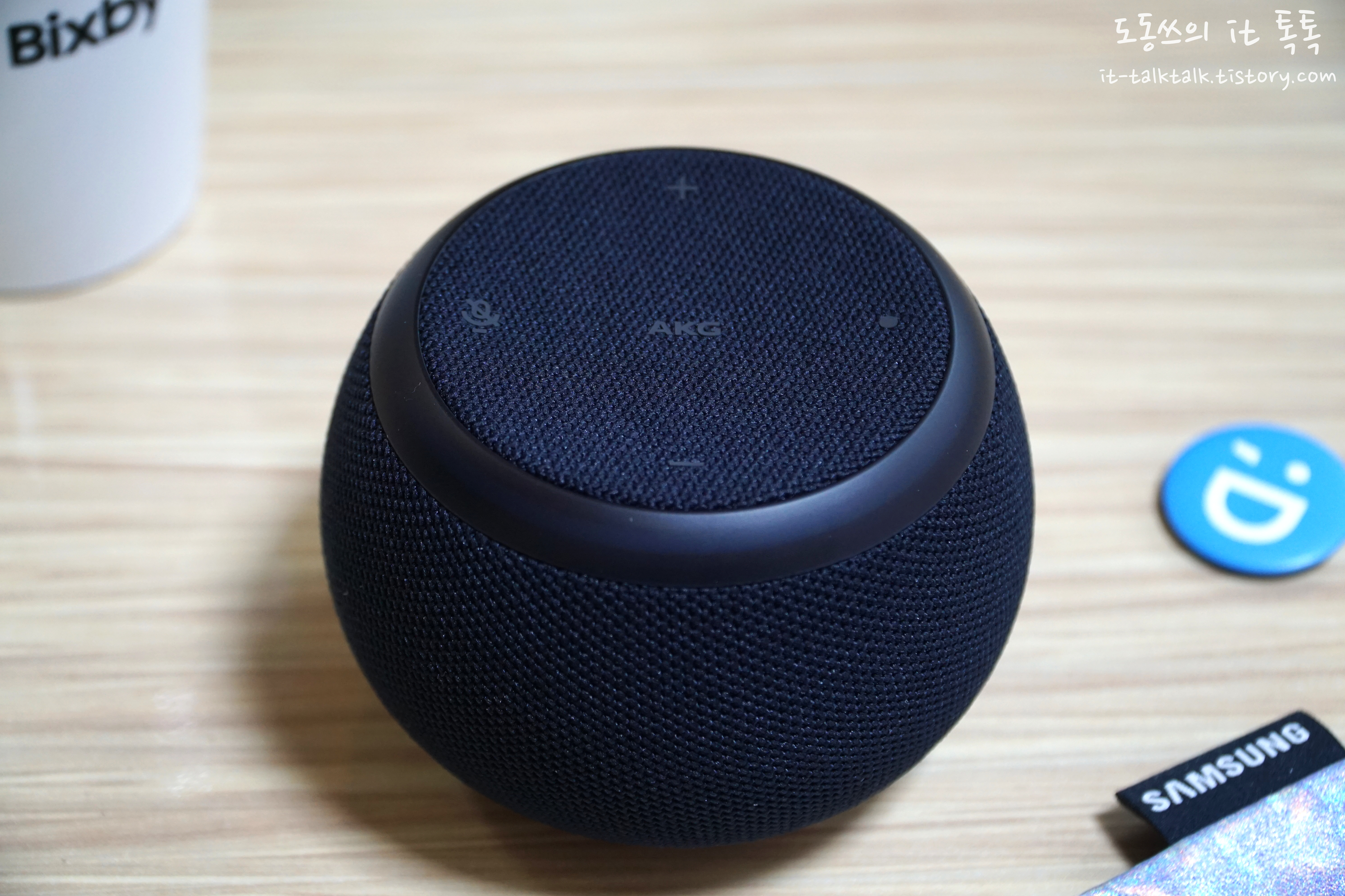기기 상단에는 볼륨 조절 버튼(상/하), 마이크 켜짐/꺼짐 버튼(좌측), 액션 버튼(우측)이 있고, 중앙에 AKG 로고가 눈에 들어옵니다. 디자인은 개인적인 취향이지만, 적당한 크기에 깔끔한 디자인을 가지고 있는 것 같습니다. 책상 및 거실 어디에 두어도 자연스럽게 어울려서 나쁘지 않은 것 같아요.