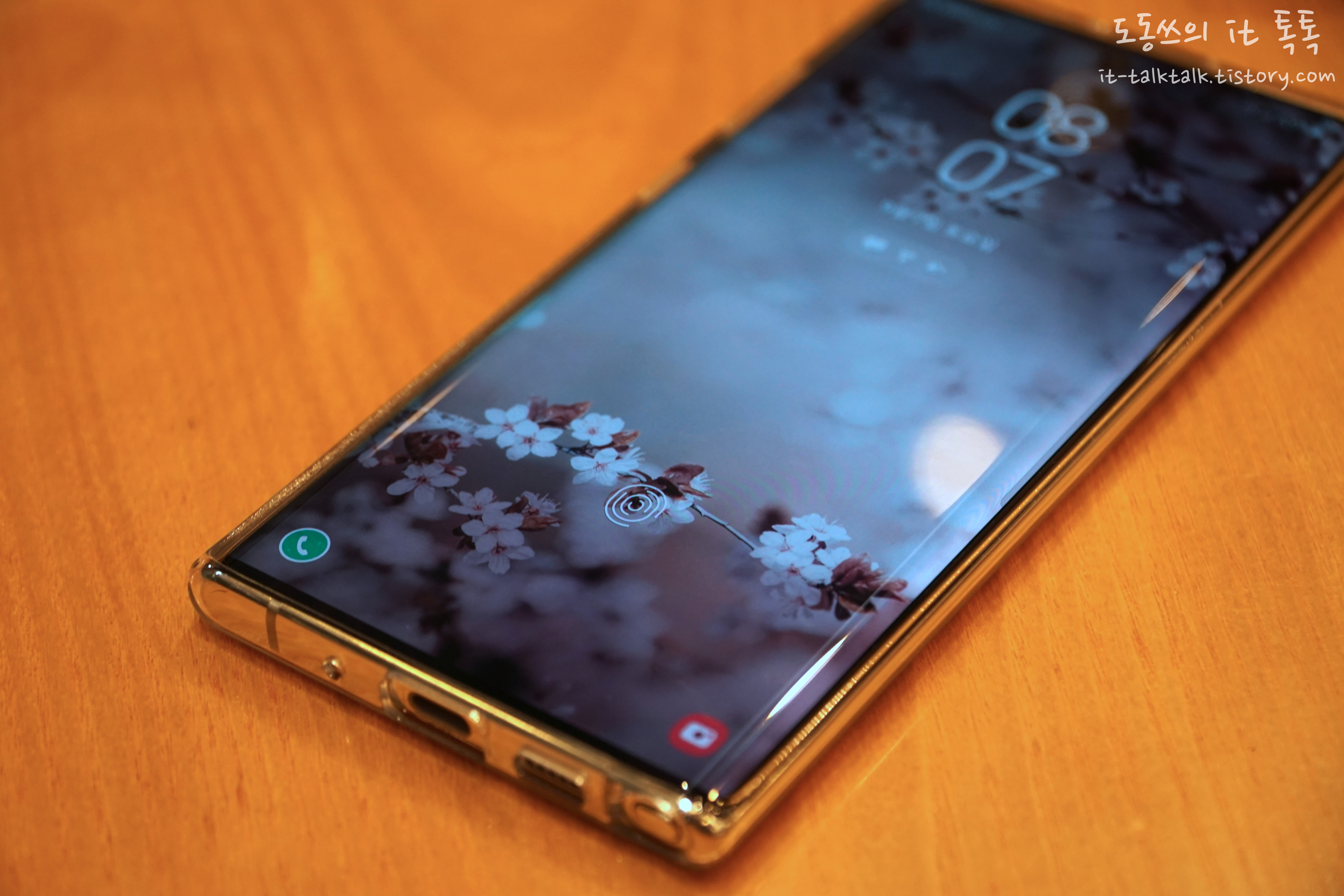 제품의 하단 지문인식 센서 및 전면 펀치홀 카메라 모습입니다.