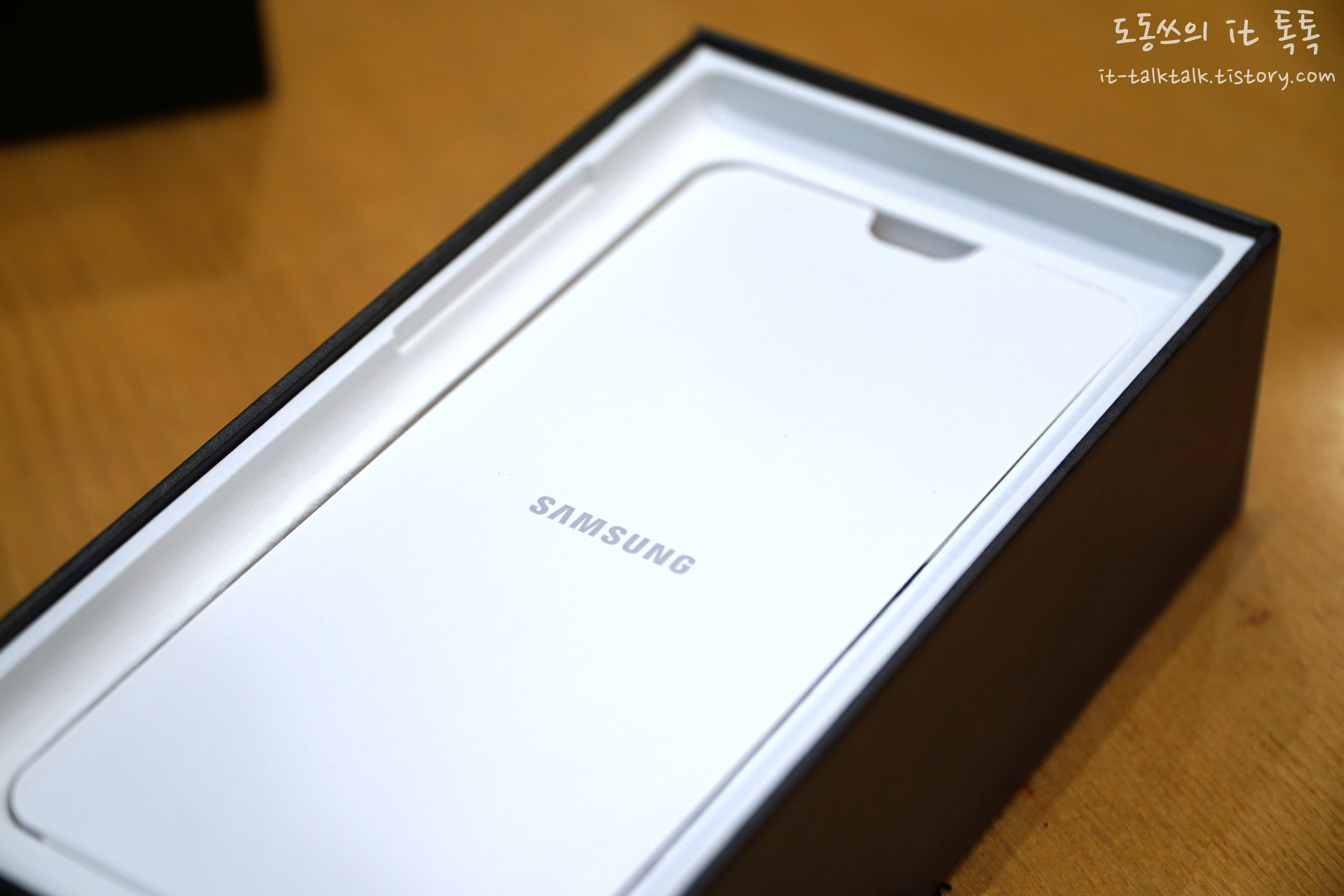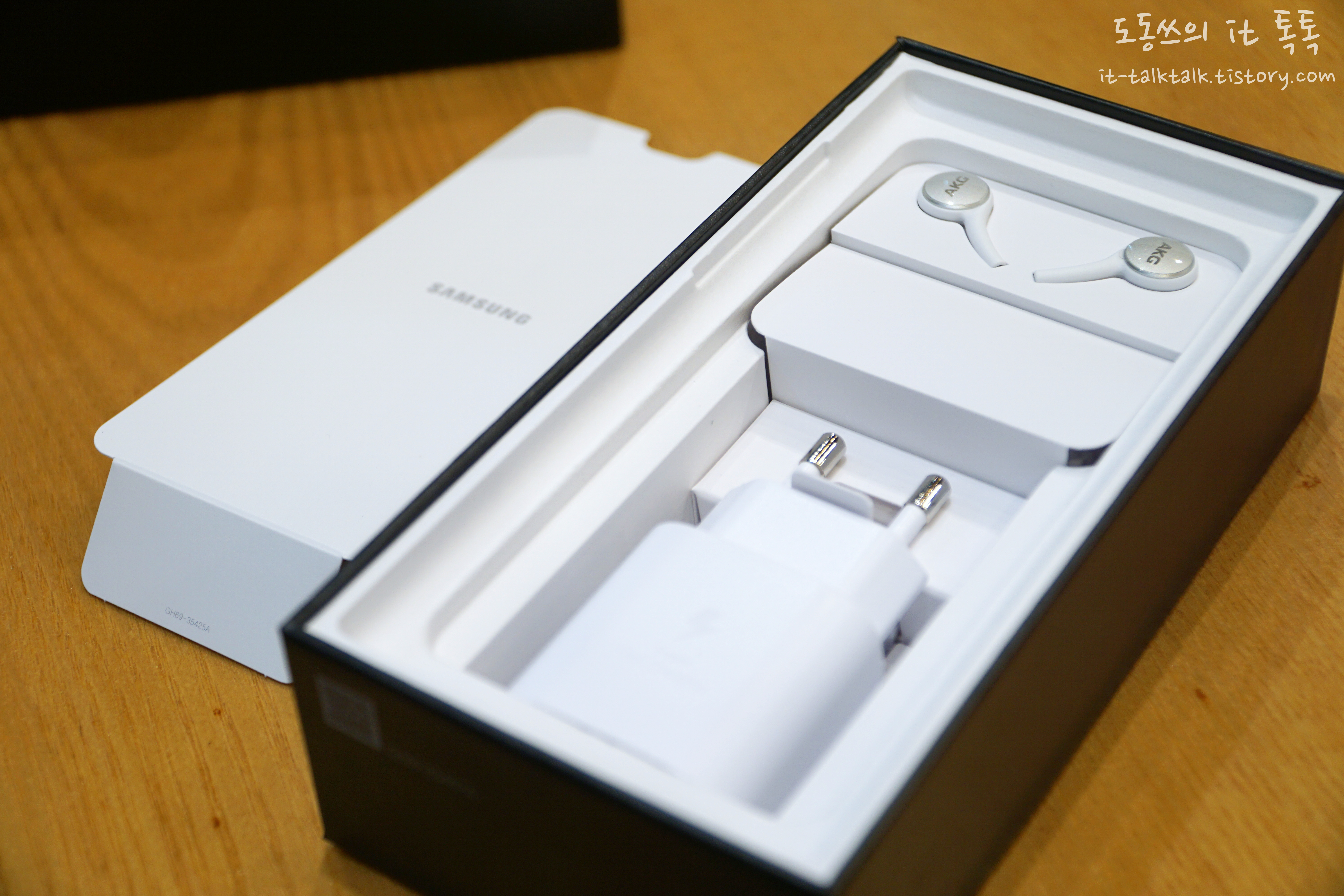 제품을 옆에 놓고 구성품을 살펴보면, 안쪽에 AKG 이어폰, 충전기 및 어댑터가 들어있네요.