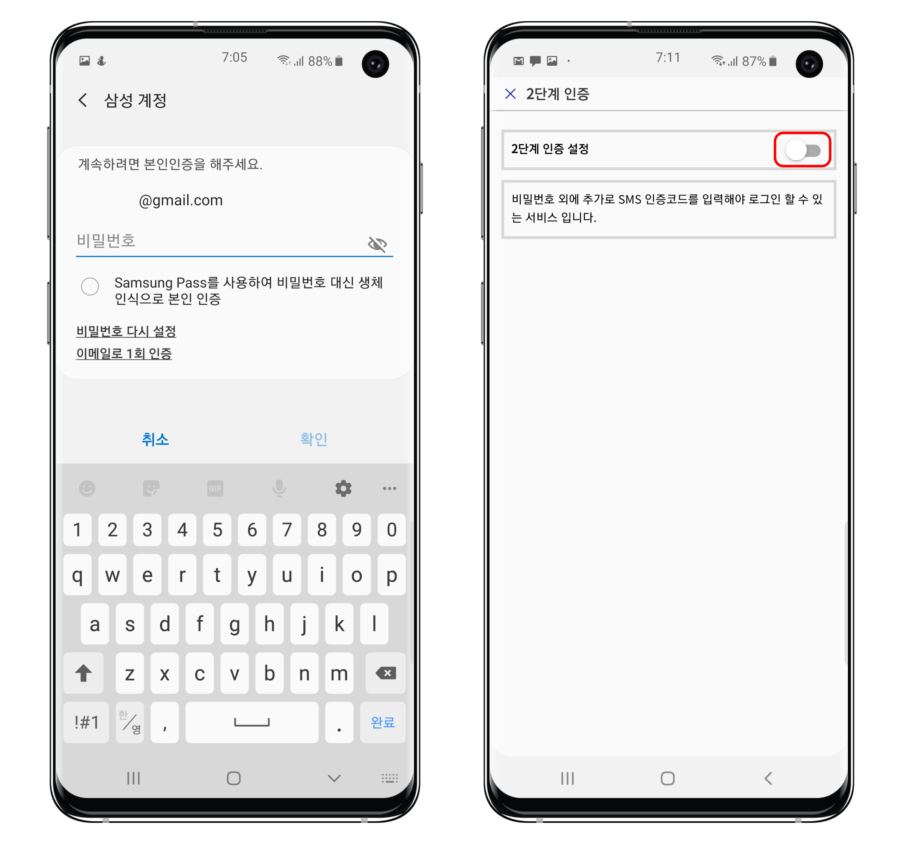삼성 계정에 대한 본인인증을 진행한 뒤, 2단계 인증 설정을 활성화합니다.