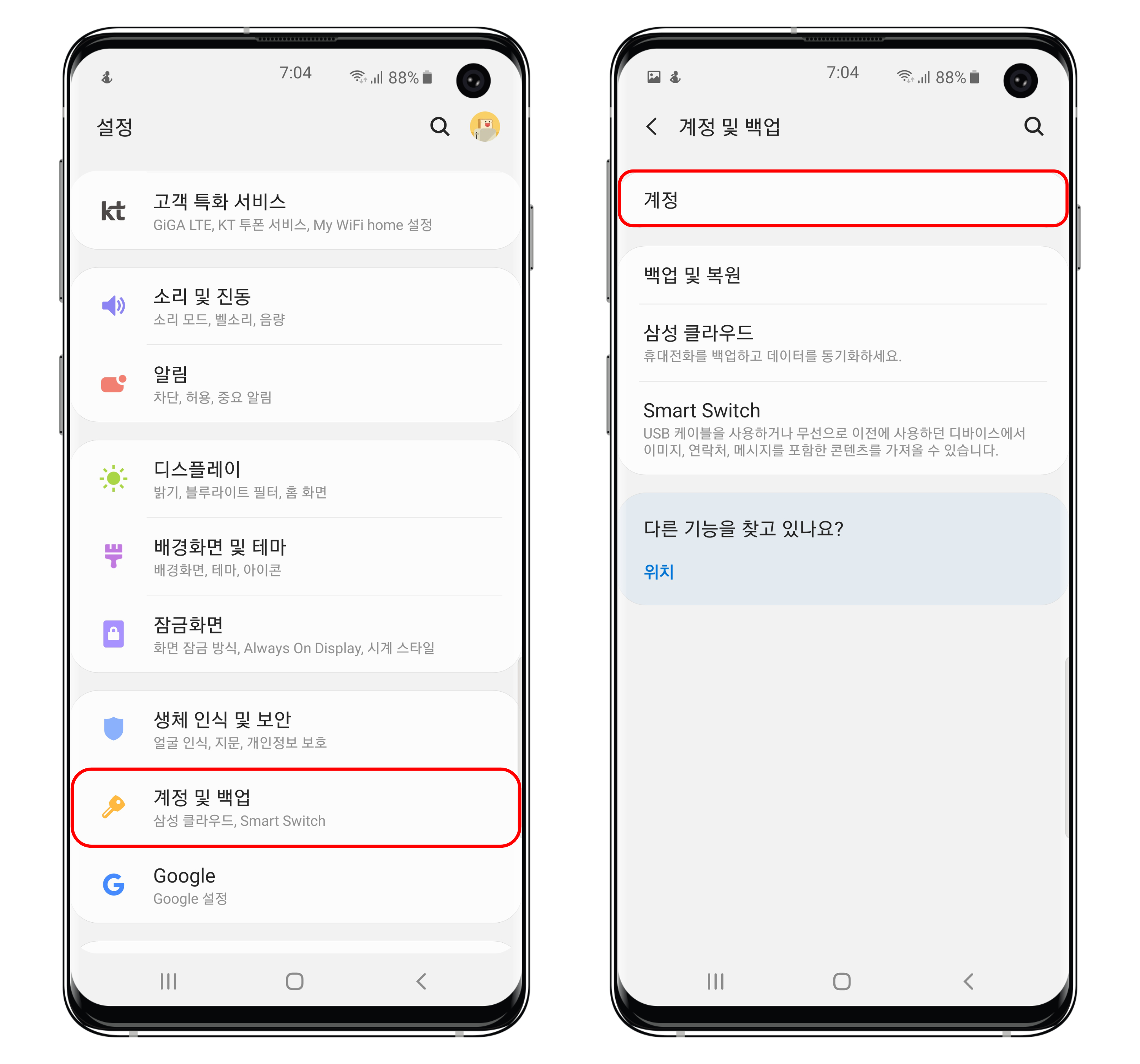 계정에서 삼성 계정을 선택한 후, 비밀번호 및 보안으로 진입하여 2단계 인증을 누릅니다.