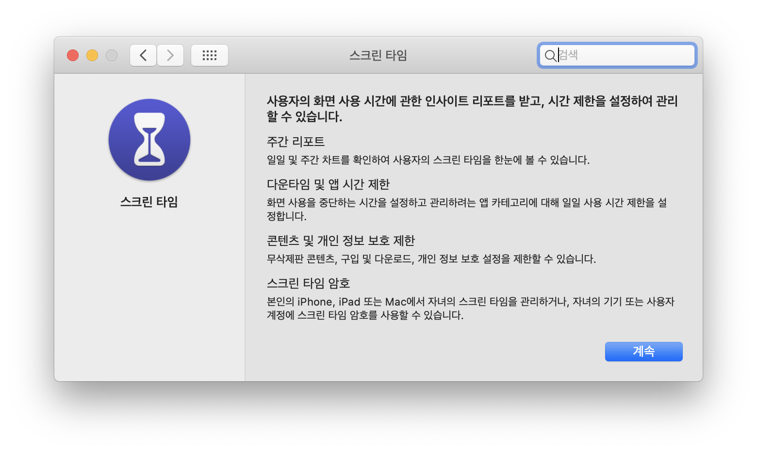 스크린 타임 사용에 대한 것에 동의(계속)를 한 후, 진행합니다.