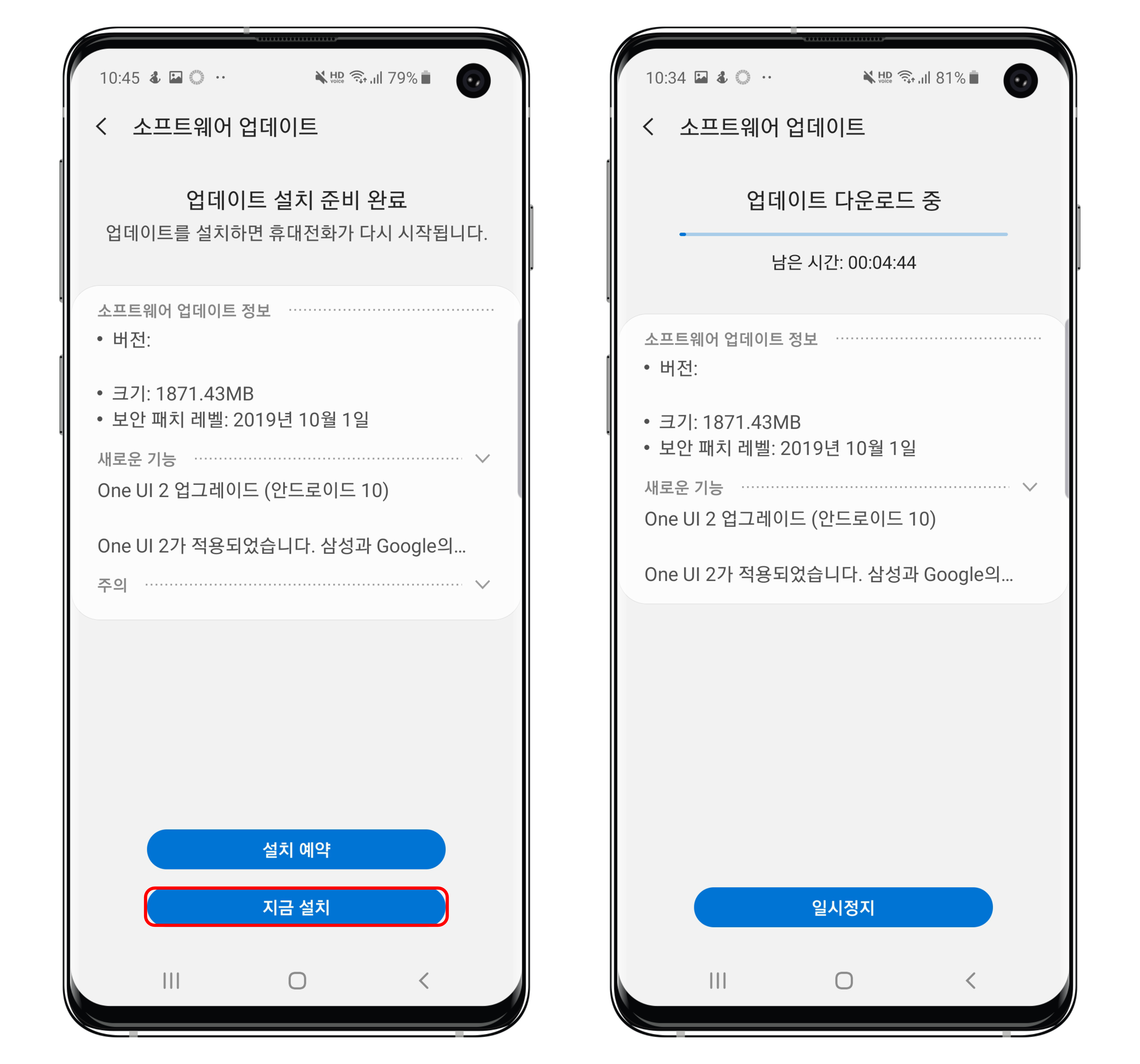 베타 프로그램 신청을 한 후에는 설정에서 소프트웨어 업데이트로 진입한 후에 새로운 업데이트를 진행하시면, One UI 2.0 및 안드로이드 10이 함께 설치됩니다.
