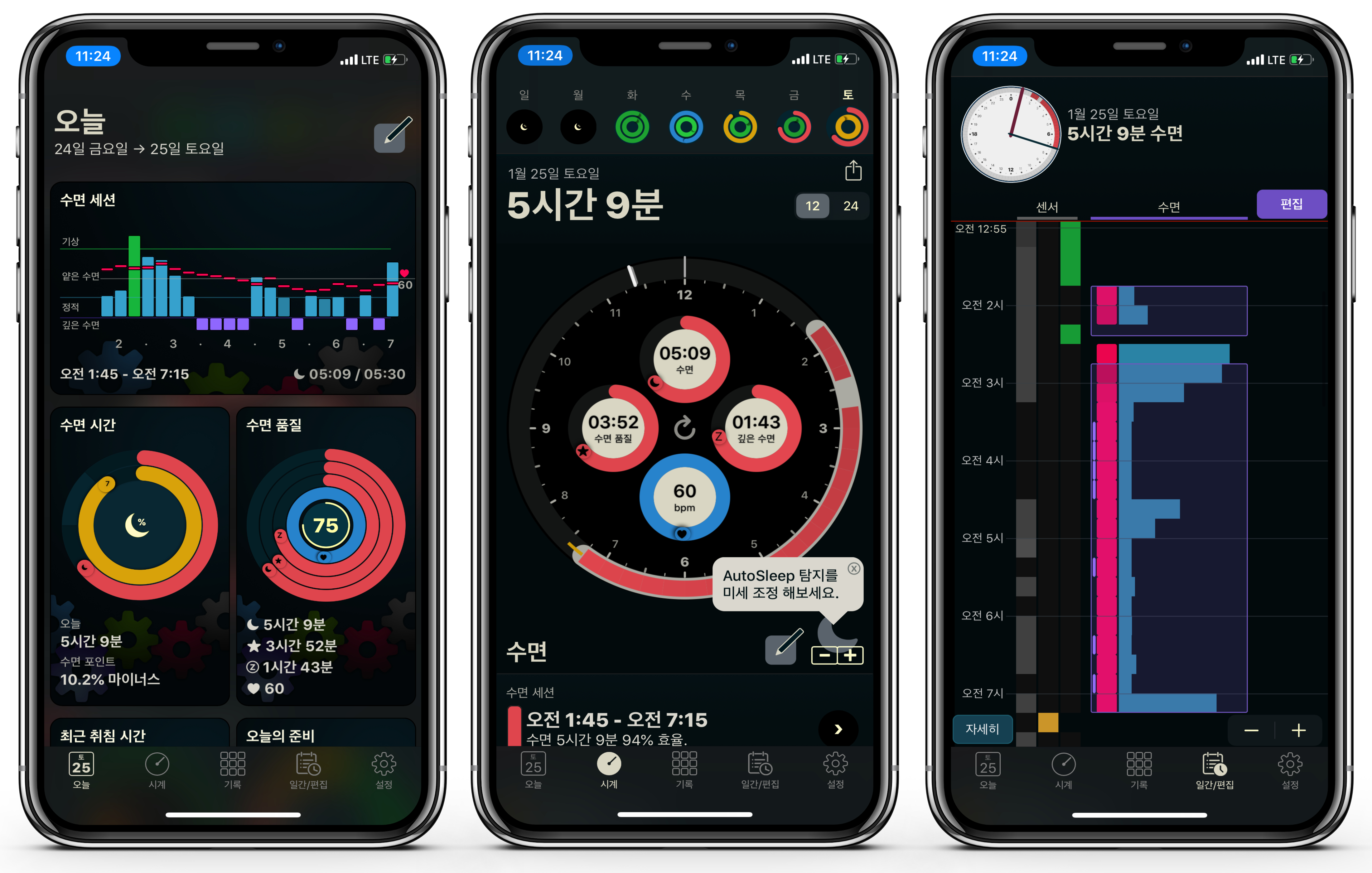 수면 품질 확인은 iPhone의 앱에서 확인할 수 있는데요. 수면 시간 및 품질, 심박수까지 분석하여 보여줍니다.