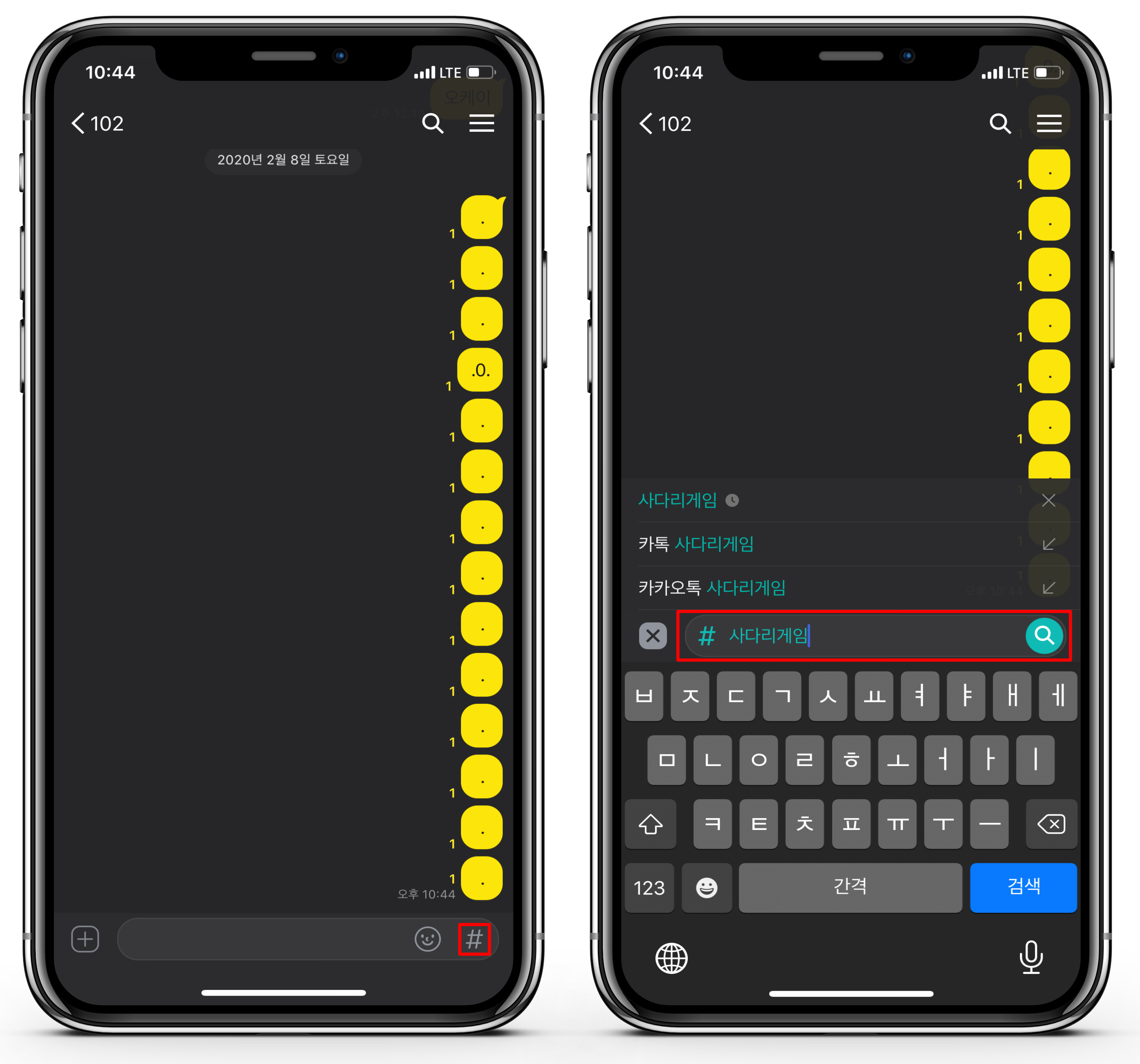 해당 기능은 카카오톡에서 바로 실행할 수 있는 장점이 있는데요. 채팅창에서 # 버튼을 누르고 원하는 게임 및 검색어를 입력해보세요.