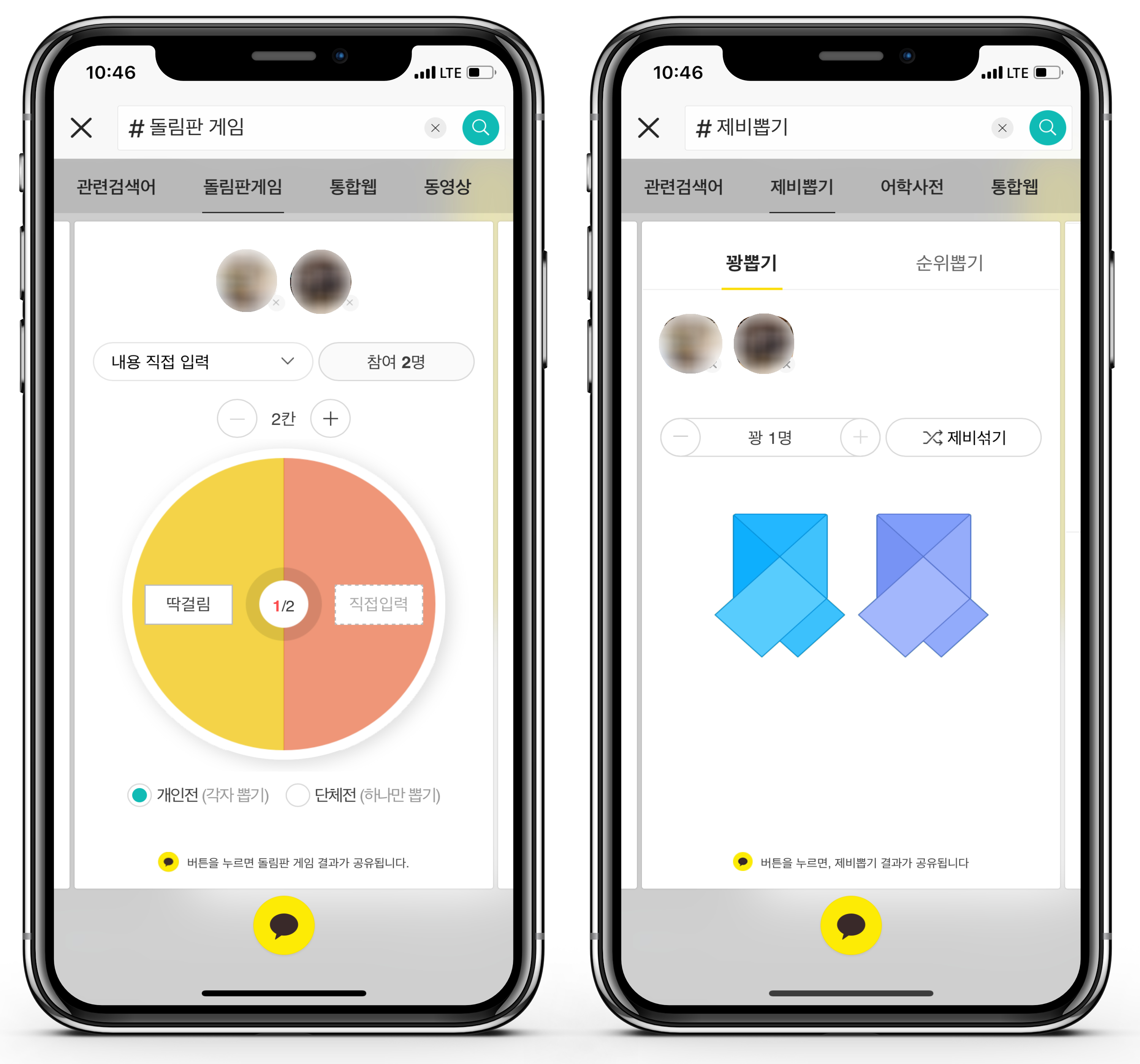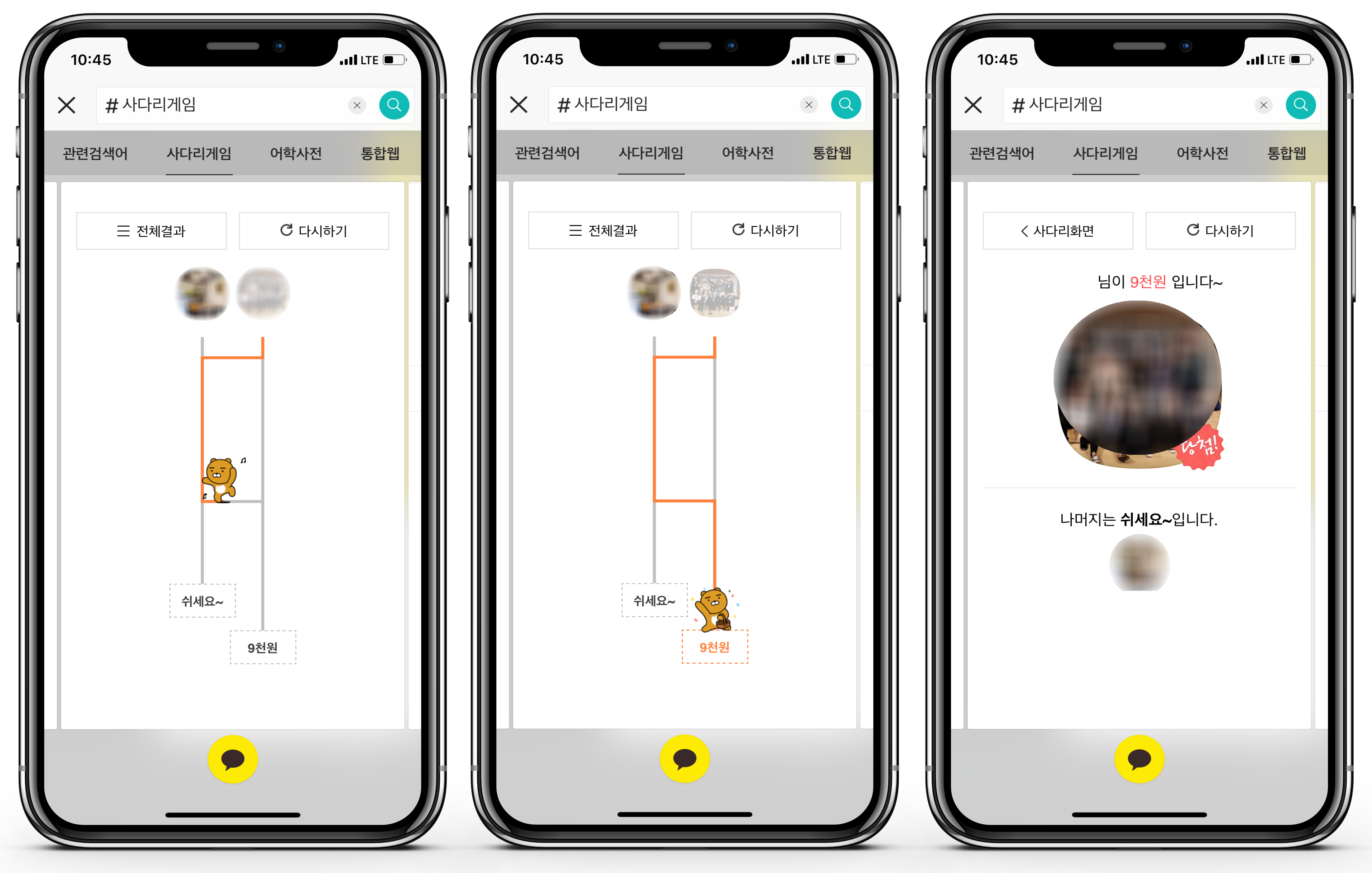 물론, 사다리 게임 외에도 돌림판 게임, 제비뽑기도 있으니 채팅방의 상황과 주제에 맞게 사용해보시는 것도 좋을 것 같습니다.