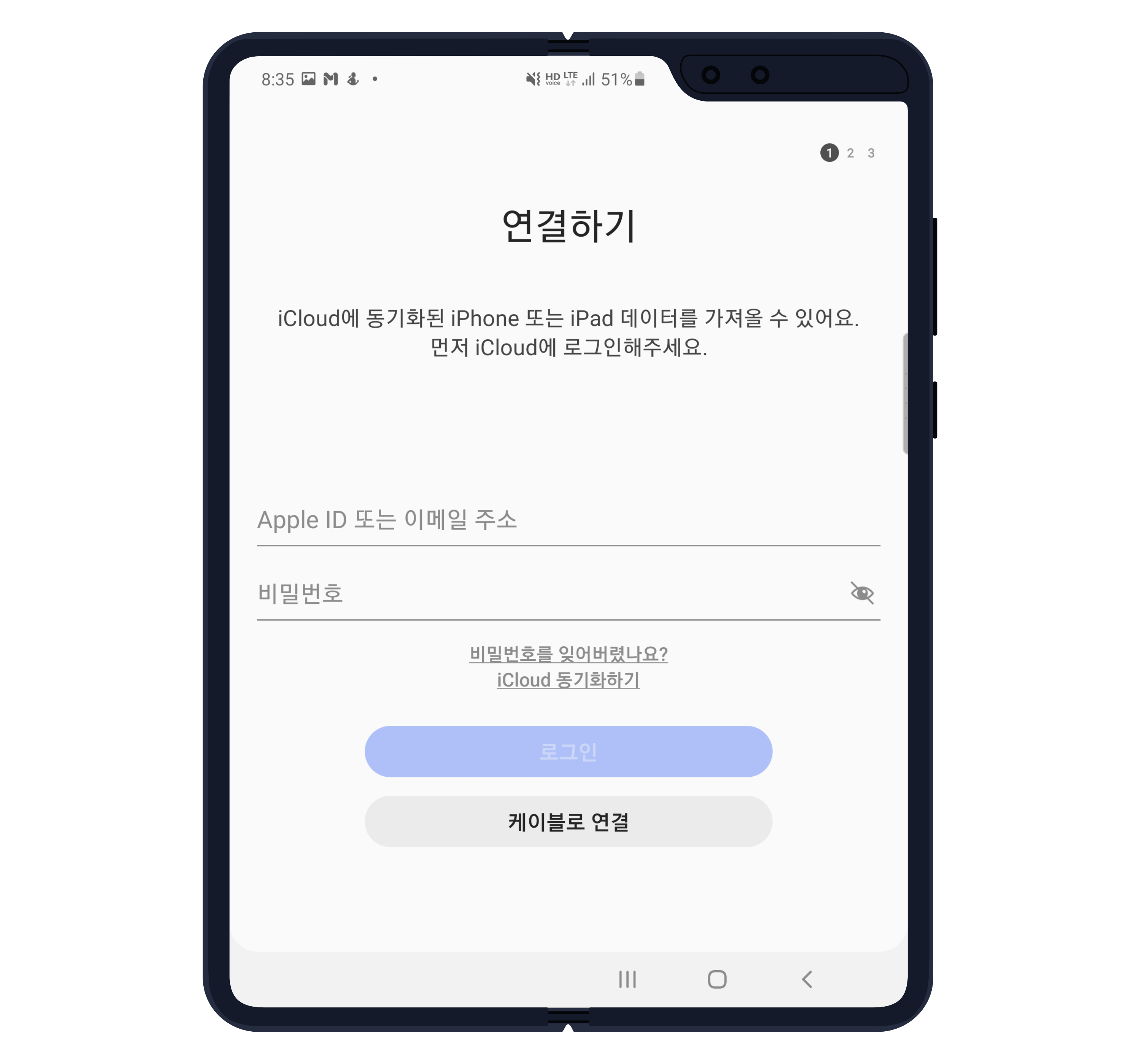 케이블이 준비되어 있지 않은 경우에는 iCloud에 무선 연결로 데이터를 가져올 수 있습니다.